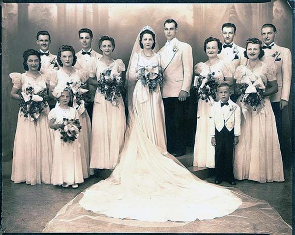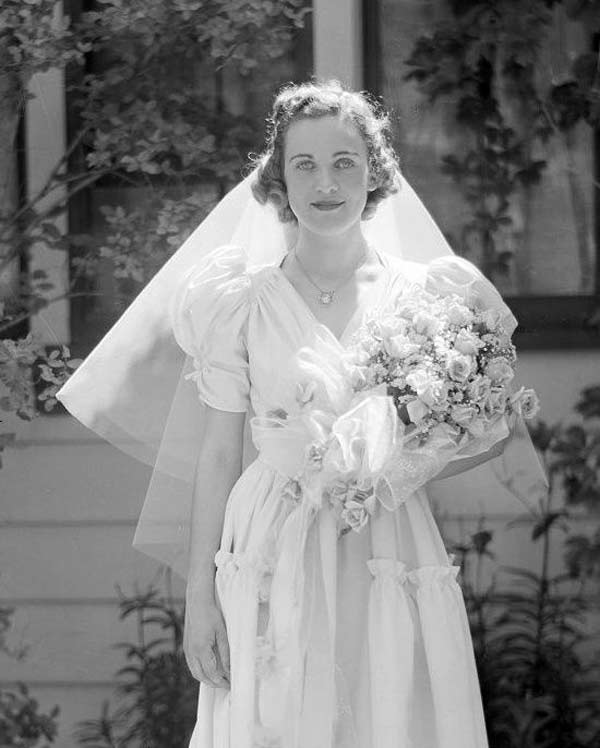 The bouquet was an absolute necessity for every bride, and most women wore a headpiece, ranging from tiaras to full length veils.