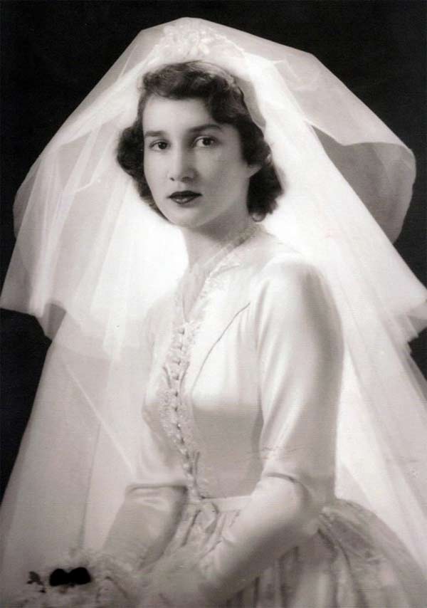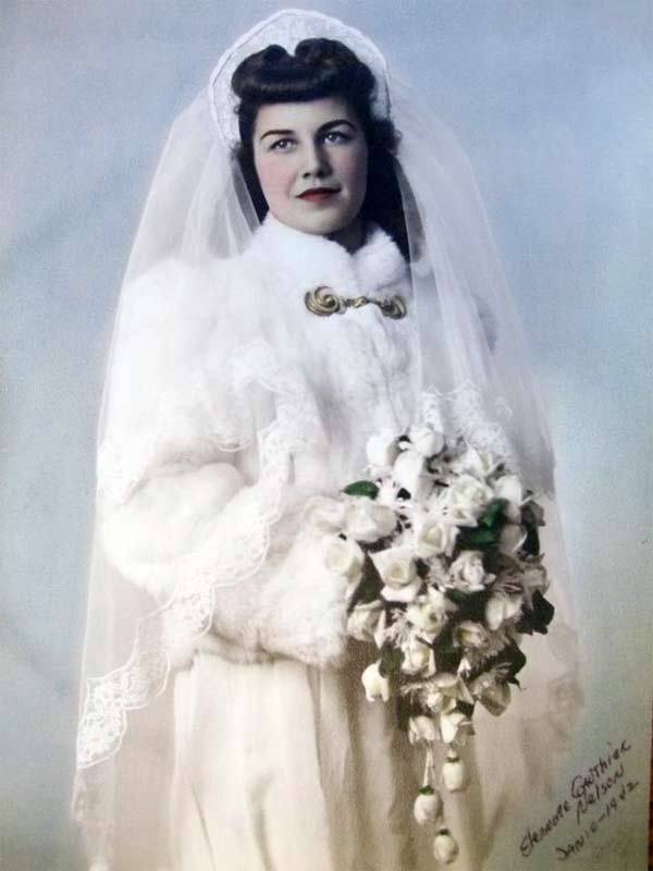 Matching gloves were optional if the wedding dress had sleeves. If the dress did not have long sleeves, then it was fashionable to wear gloves that came up past the elbow.