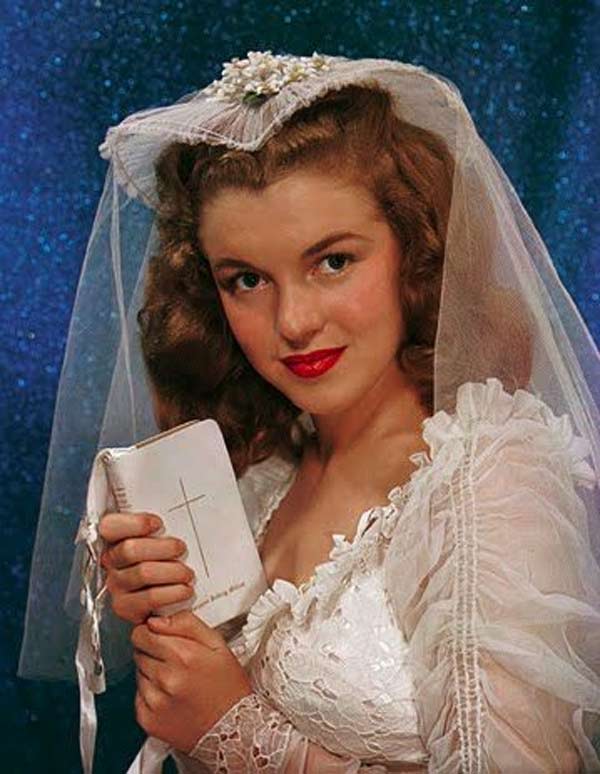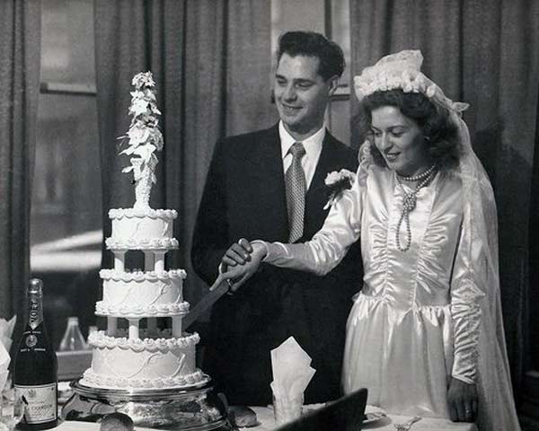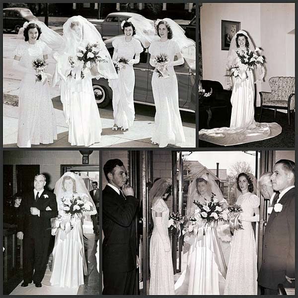 Traditional wedding dresses in the 1940s were white. Starting in the mid 1940s, many young celebrities were getting hitched, being photographed wearing dress suits or their Sunday best. It had become pretty normal to skirt the whole wedding dress altogether.