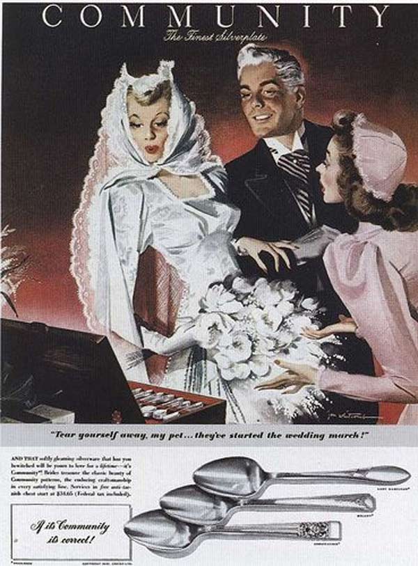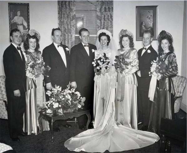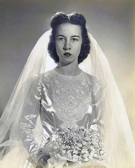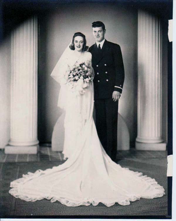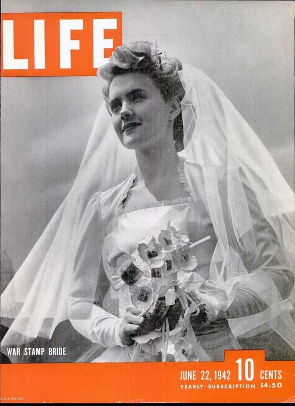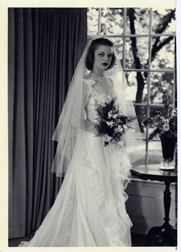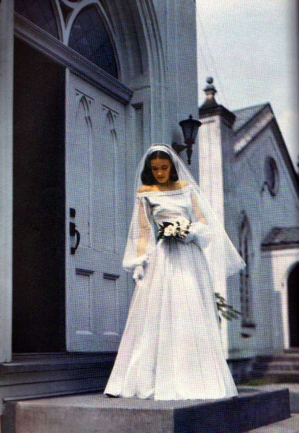 As the decade progressed, wedding gowns became more snug and less extravagant. Sure, you’d see wedding dresses that could double as parachutes (and after the war some dresses were even made from them!), but it was a noticeable different how much more trim wedding dresses are in the late 1940s.