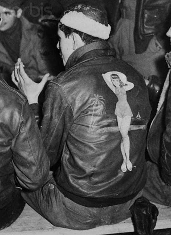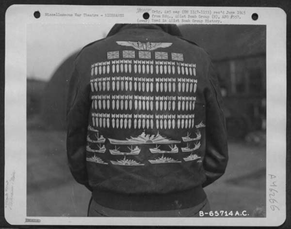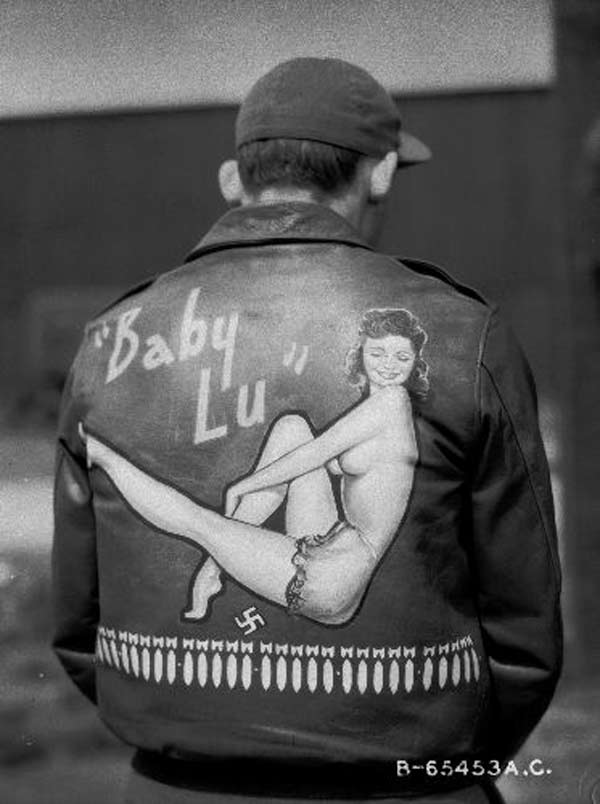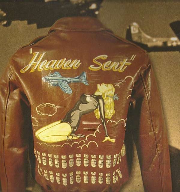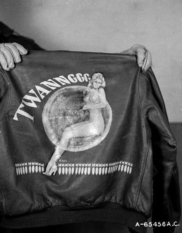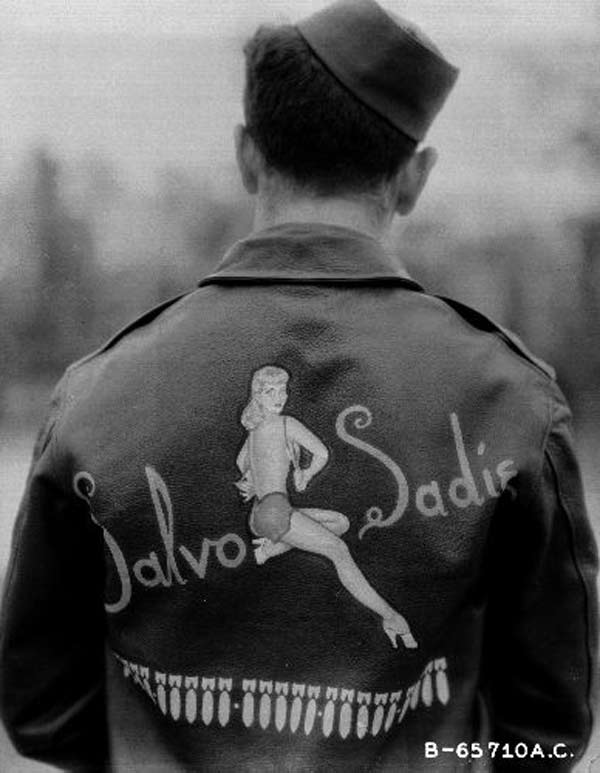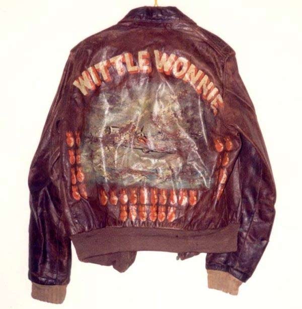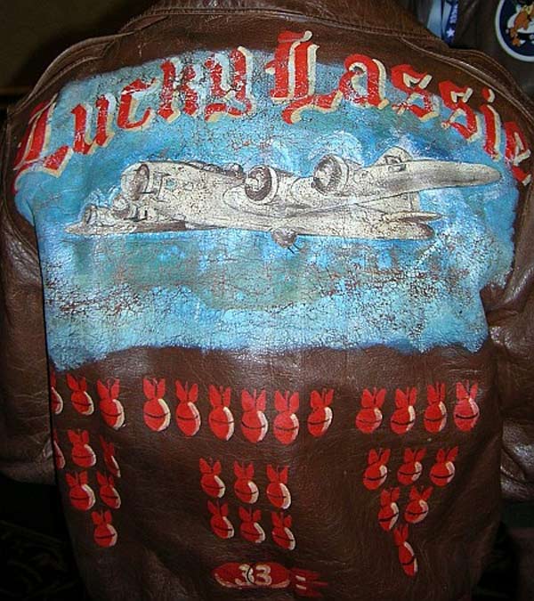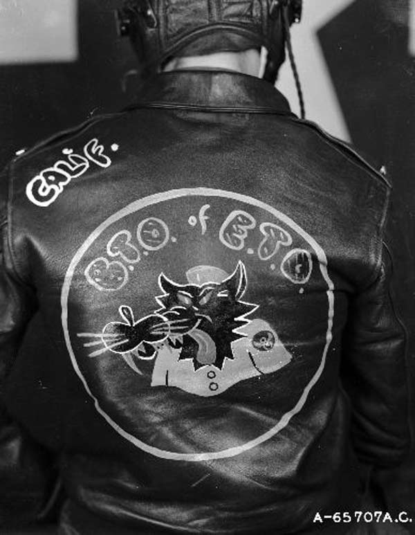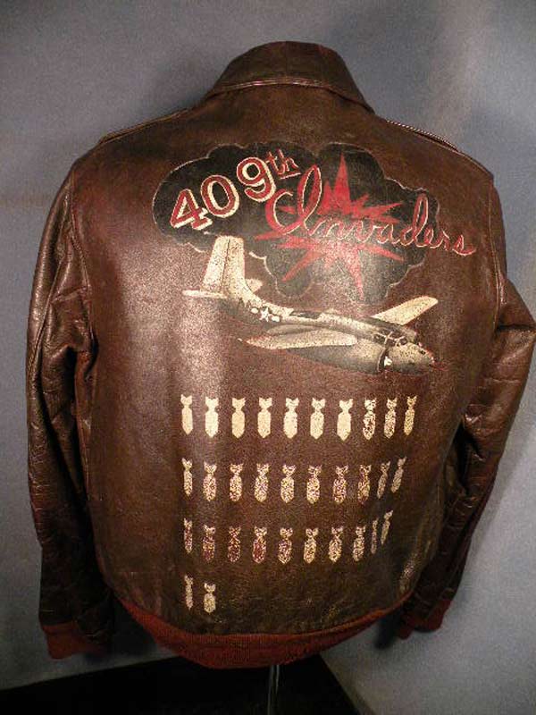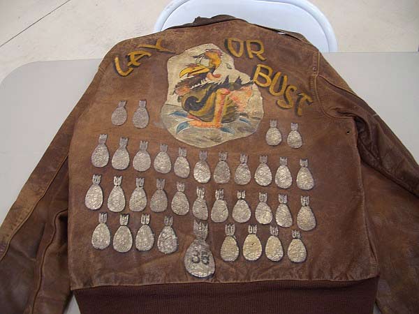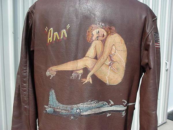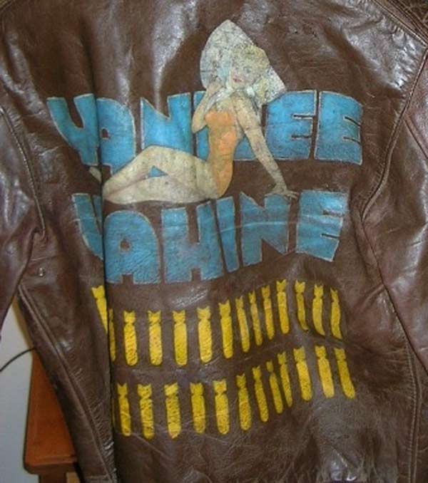 They often decorated their jackets with squadron patches and artwork painted on the back. We have an extensive A-2 flying jacket picture gallery below. Many of the paintings featured barely clothed women and hilarious words like: Twwwaaaaannnngg and Miss Wiss Ding. Jackets also usually included the name of the plane they flew.