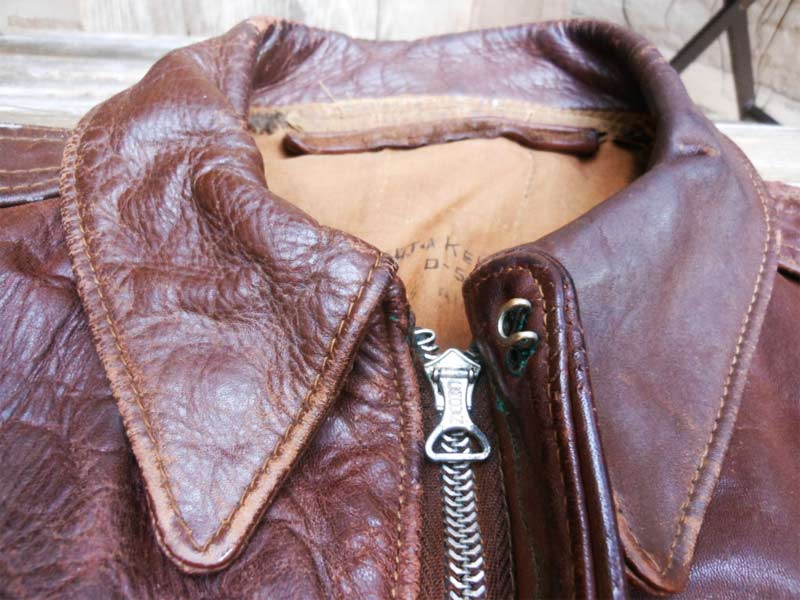 The A-1’s stand-up, button-close collar, was replaced by a shirt-style leather collar, with hidden snaps at the points and a hook-and-eye latch at the throat. Stitched-down shoulder straps were another addition to this tight-fitting beauty.