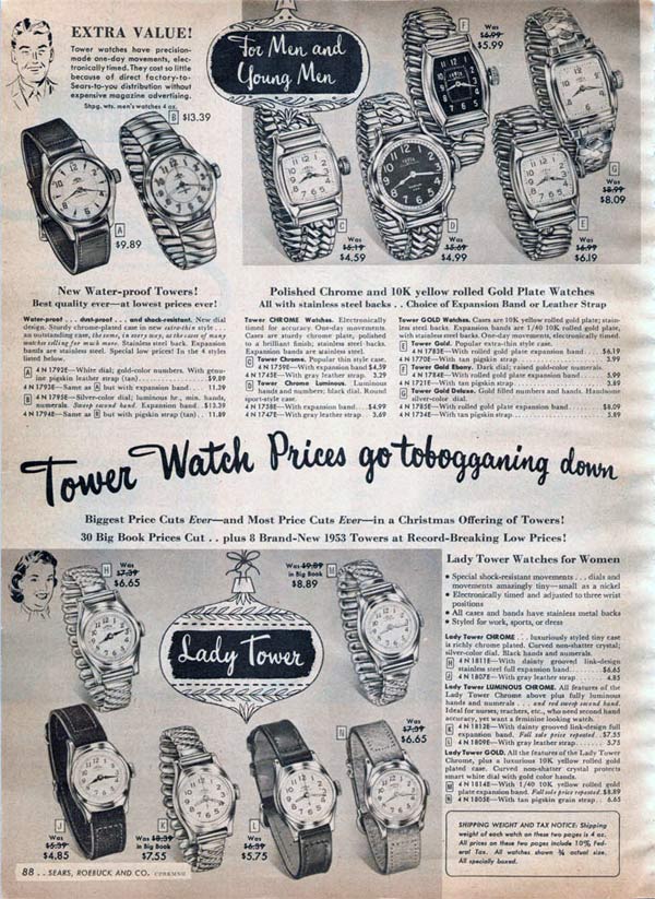 Different watch brands that were popular in the 1950s include Tower, Timex, Orvin, Bulova and Elgin. Watch faces came in many different shapes and colors. Square and round faces were the most popular.