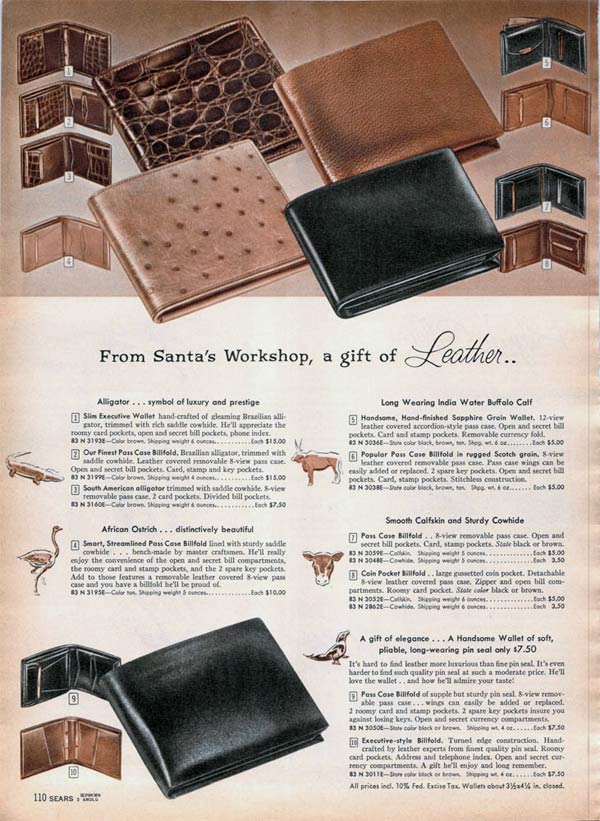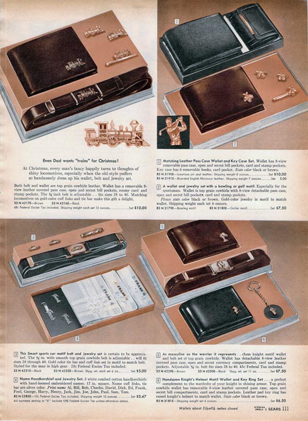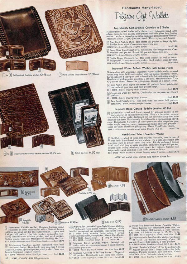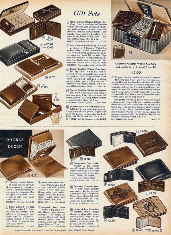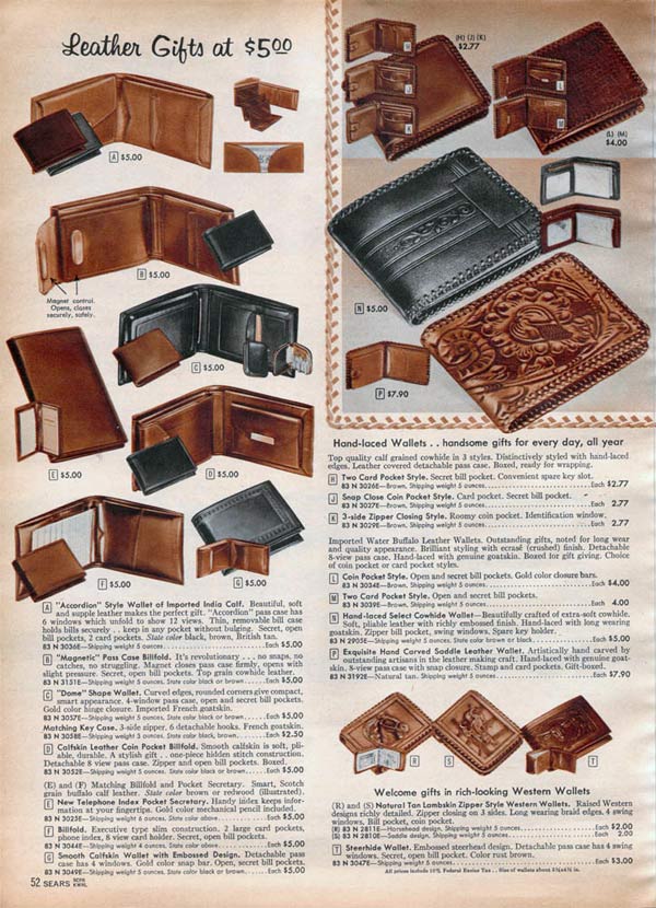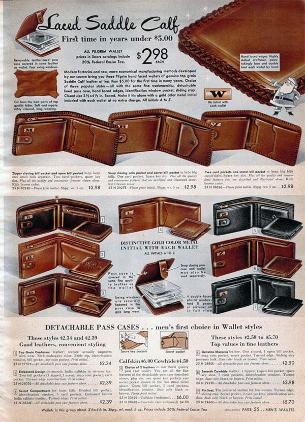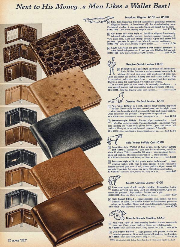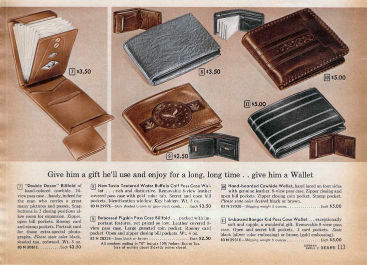 Some wallets zipped around the edges to keep it closed and other had secret compartments. For that extra personal touch, men could get a wallet with his initials, his name or his favorite activity (like fishing) embossed on the front.