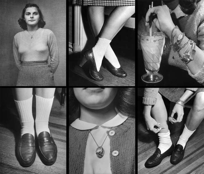 The 1950s circle skirts were worn with tucked-in, tight fitting blouses. It was usually tied together with a wide belt, flat-heeled shoes and bobby socks or anklets.