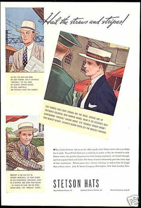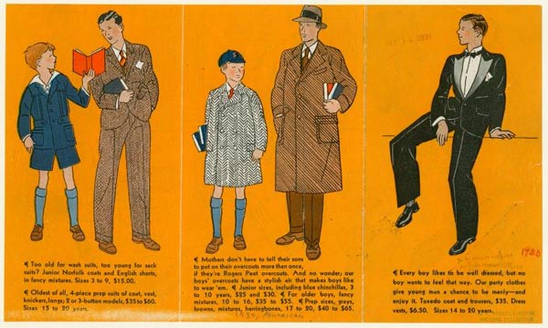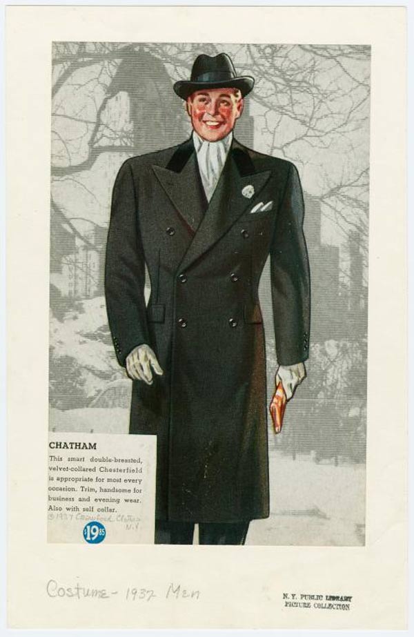 For men, there were a few developments. In the spring and summer, men wore a single-breasted suit with patch pockets and panama hat. In the fall, he wore a double-breasted dark blue suit with wide-cuffed, double-pleated, high-waisted trousers.