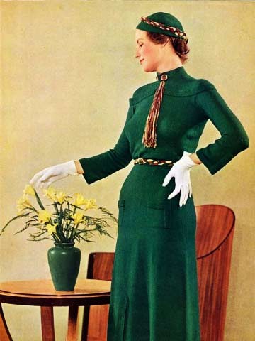 In 1936, women loved wearing a plum or dark green wool tailored dress with long, tight sleeves and slightly bloused bodice. The dress gently flared at mid-calf, has side pleats and is worn with a wide leather belt.