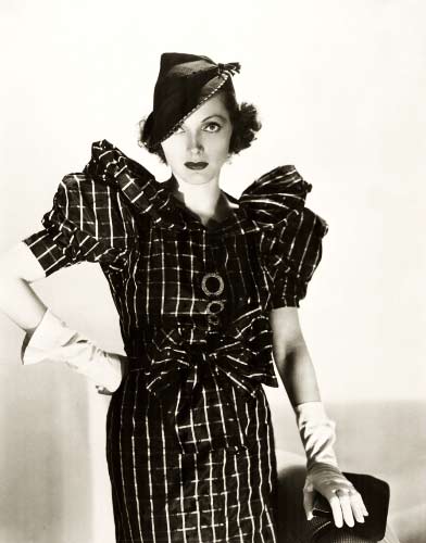 With the Clara Bow flapper look becoming passe, the new rage is the sophisticated Garbo look. The silhouette is tall and slender, emphasizing broad shoulders, a small bosom, streamlined hips and a standard waistline.
