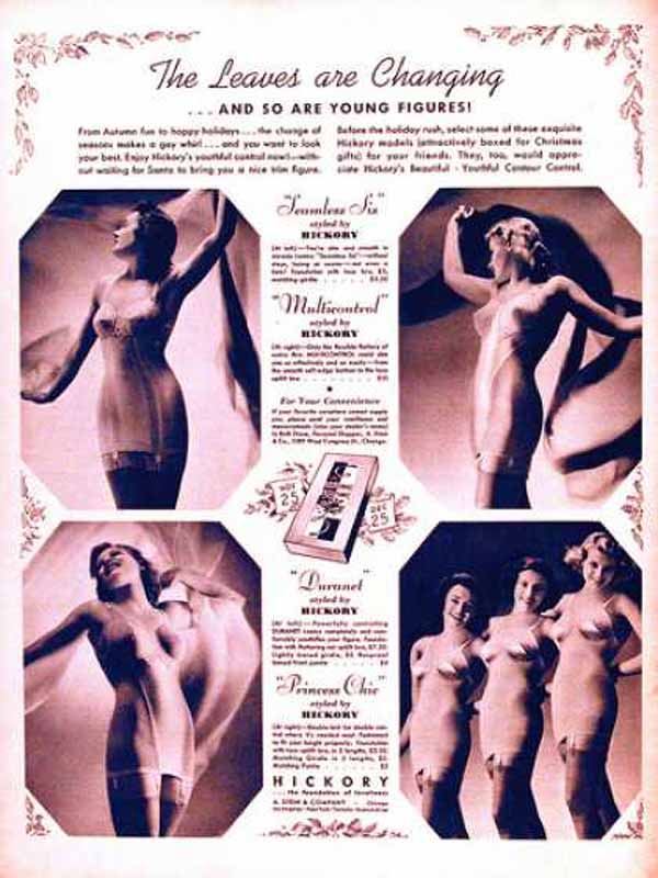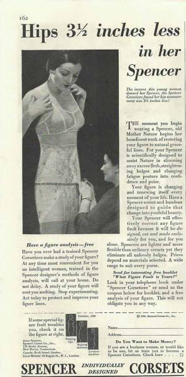 In 1933, the V-shape (wide shoulders to slim waist with flared skirt) placed an even stronger emphasis on the corset. There was a two-way stretch and the new, all-in-one, full-length corset with Lastex bra and six suspenders to hold up stockings.
