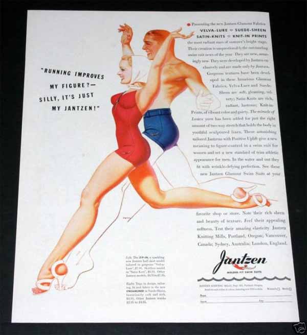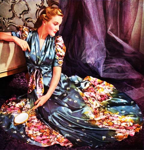 Thick, clinging fabrics are enormously popular. The gradual broadening of the shoulders lead to three-inch shoulder pads; found even in night gowns.