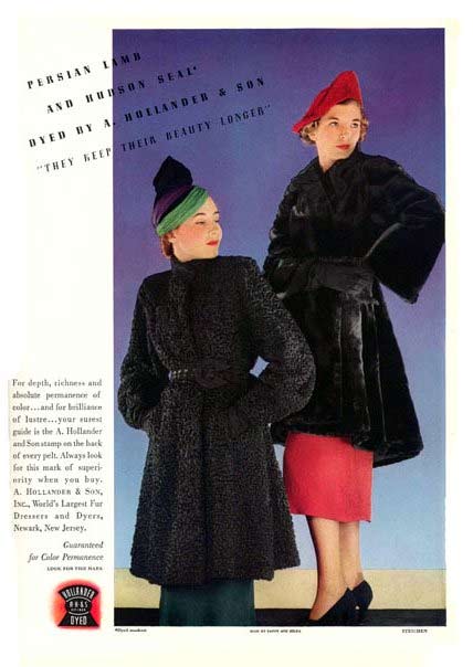 Hot colors combos in 1943 are brown & pink, and prune & turquoise. Women still loved gloves and silver fox broadtail.