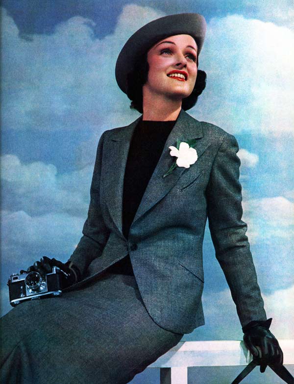 Padded shoulders were even more pronounced in 1934. The “little black dress” is the new evening style, but some women loved to express themselves in loud-colored long dinner suits.