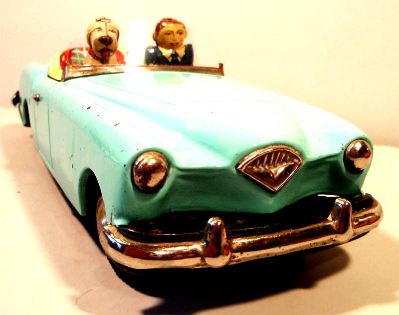 The original dog would have been white and made of fuzzy, fur-like material. The white dogs became dirty easily and were often discarded. This Ichiko 1959 Buick friction tin toy is very hard to find in excellent condition.