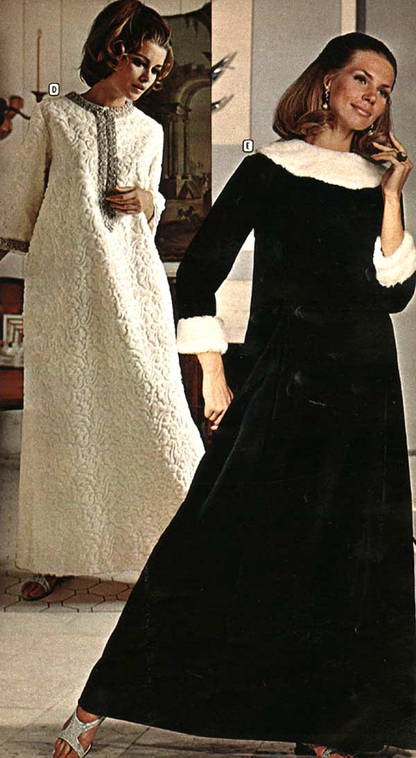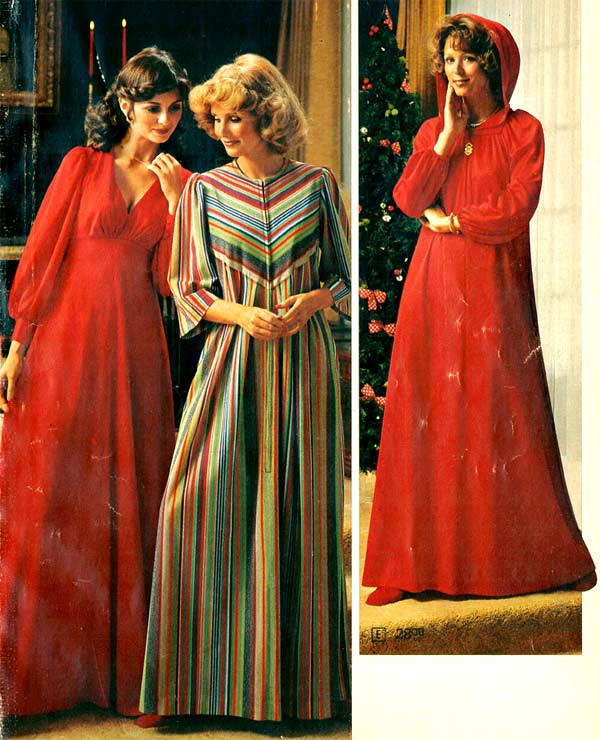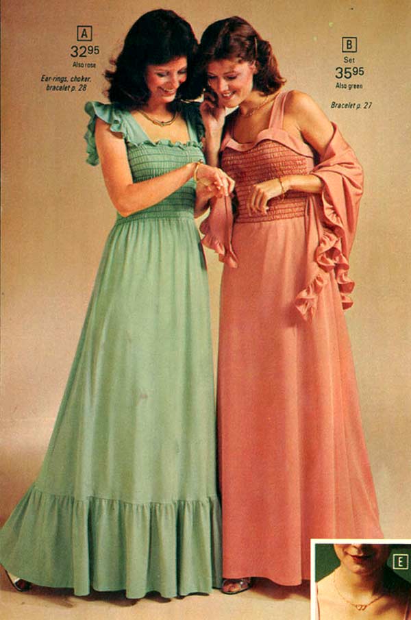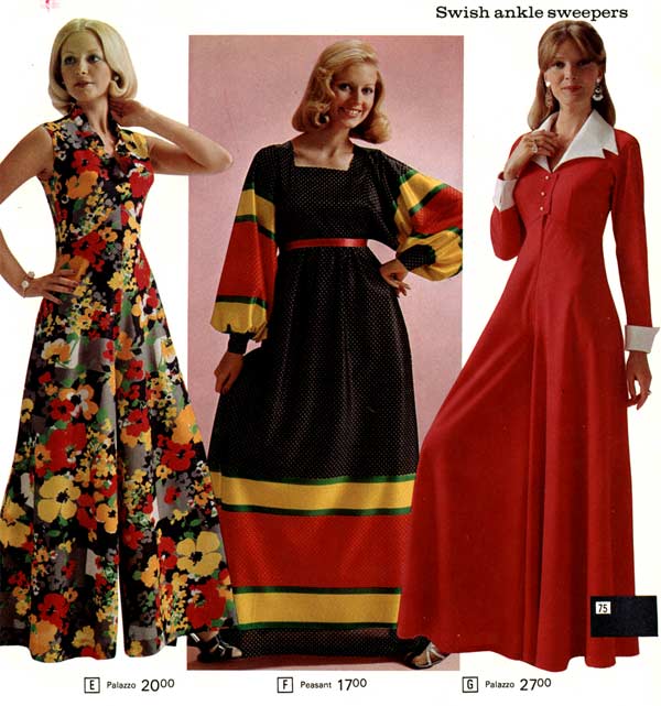 Many women had different dresses for different occasions. They wore evening gowns at home, which were silky smooth, loose fitting and very comfortable. They were also known as ankle sweepers. Instead of wearing fluffy slippers like their mothers, the fashion-conscious seventies woman was encouraged to wear mid-height heels for added “excitement.”