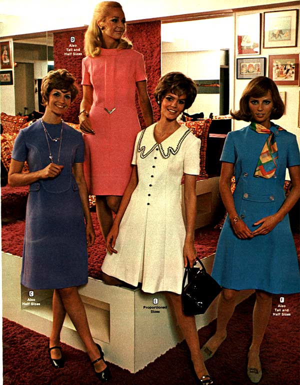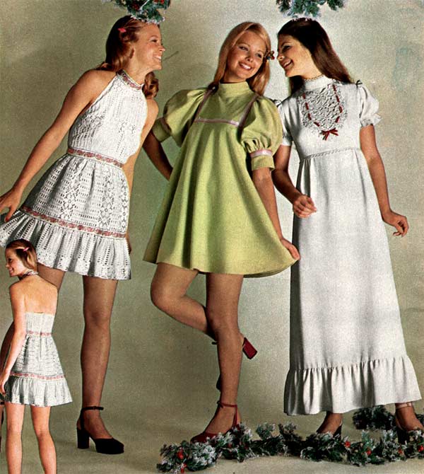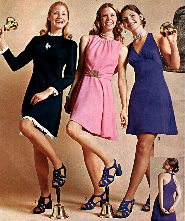 The hemline was all over the place. Both short dresses and long dresses could be worn in almost any situation. Typically, younger women preferred the shorter skirts.