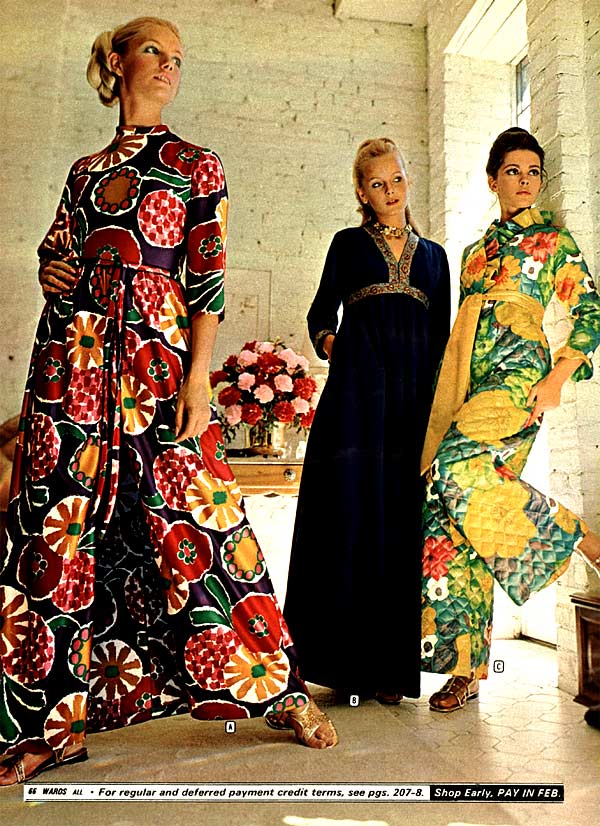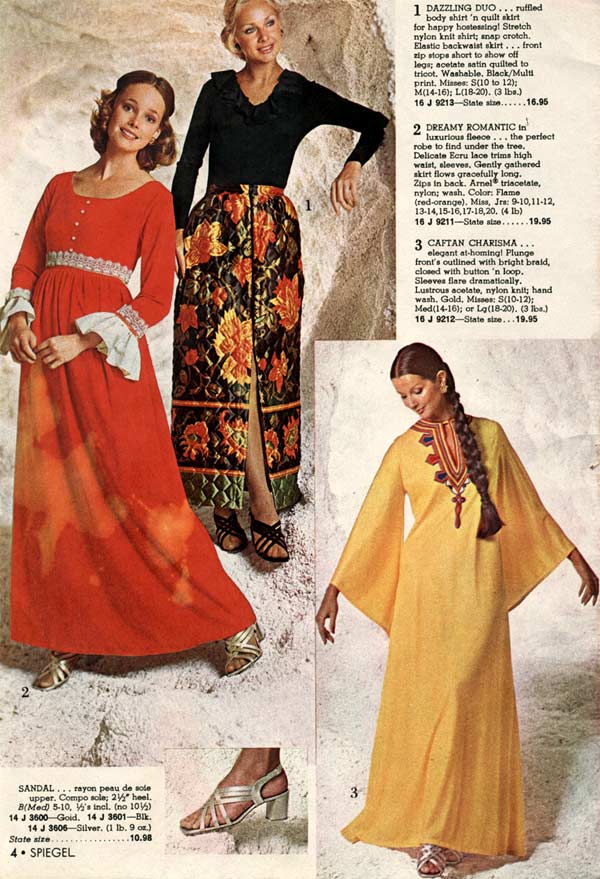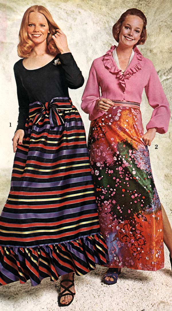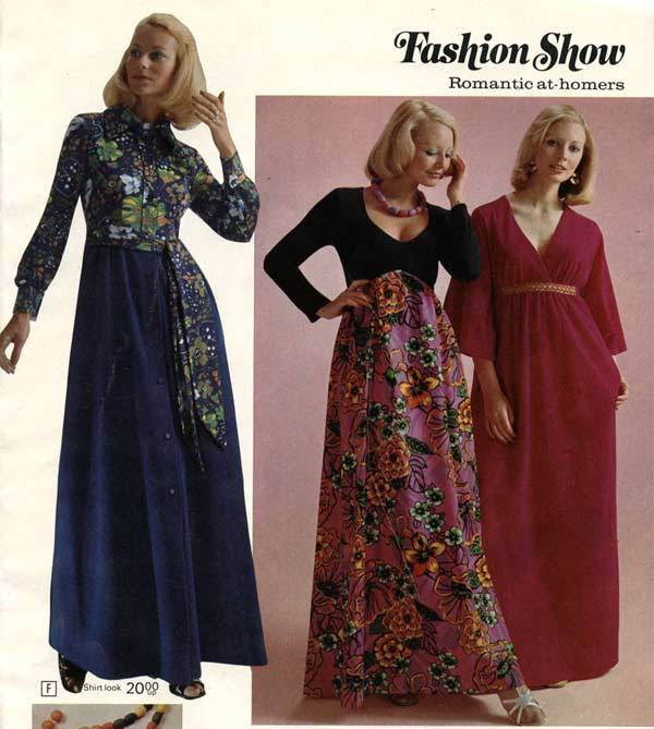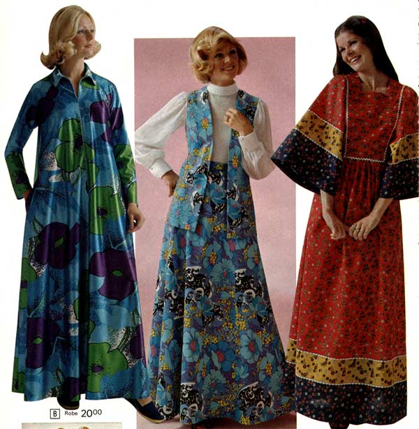 Much of the experimental, so-called “hippie” style actually originated in the early 1970s. Flower power was in full swing at the beginning of the decade and it showed in the flowing, floral patterns that decorated many dresses from that era.
