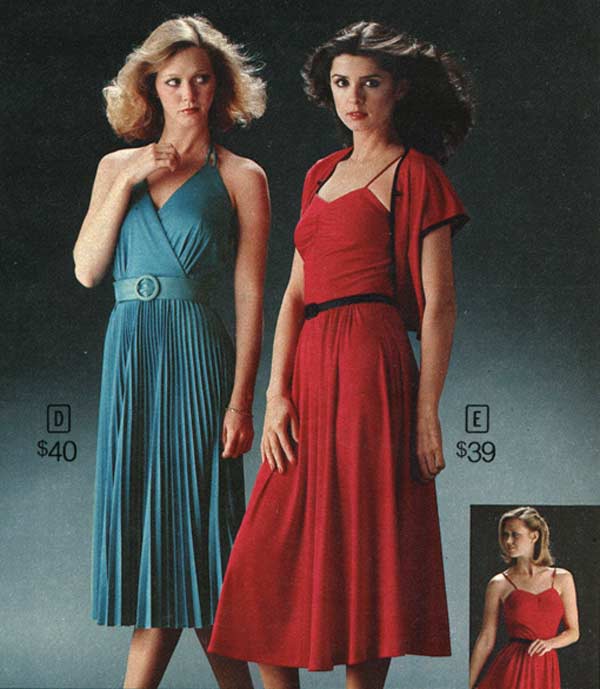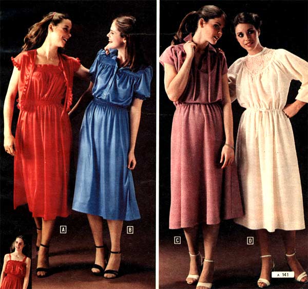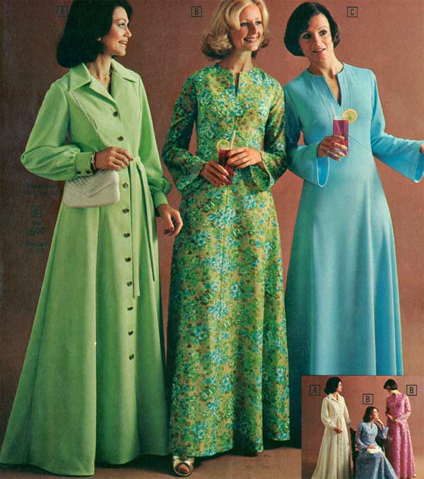 1970s dresses also liked a bit of ethnic flair. Indian patterns and Native American patterns were some of the most popular. Asian patterns also had a good run in the mid-seventies. Certainly women loved wild colors and floral patterns in the early seventies. That changed later on — the mid-seventies were dominated by pastels and women in the late 1970s preferred earthy tones like browns, light blues and tans.