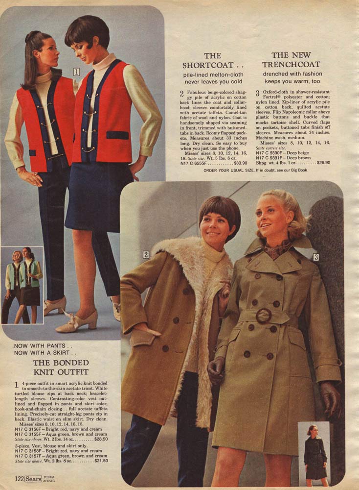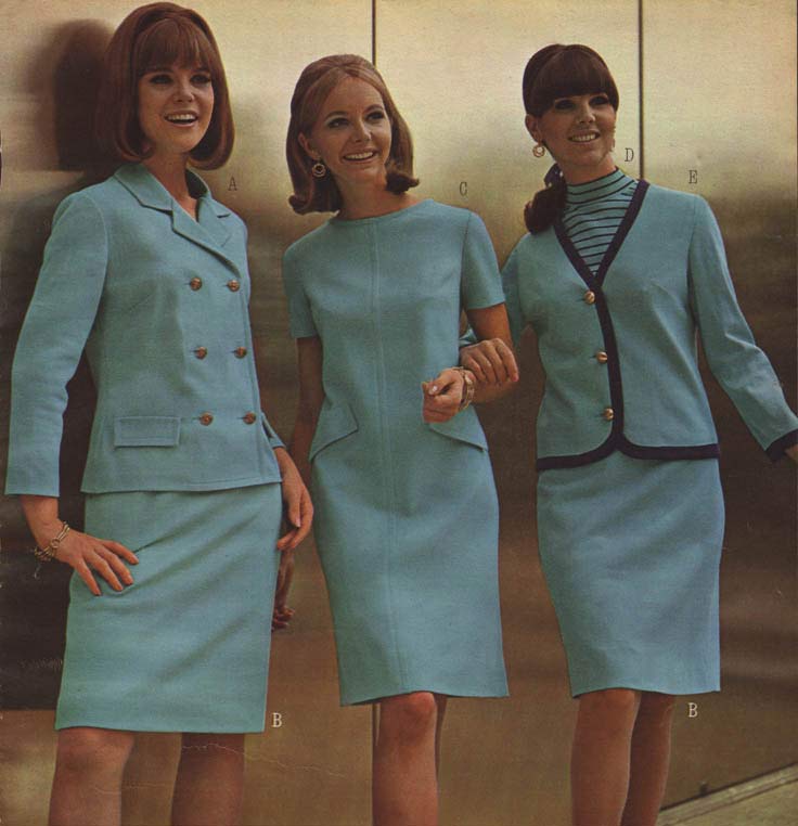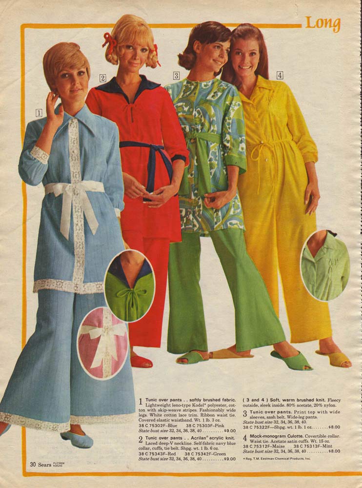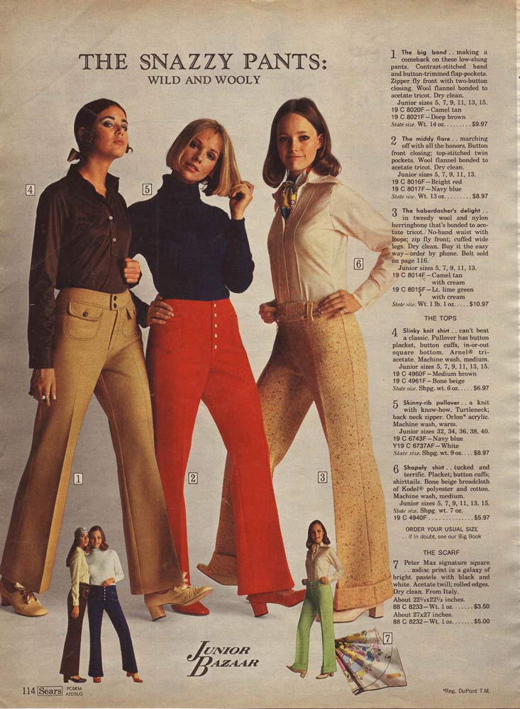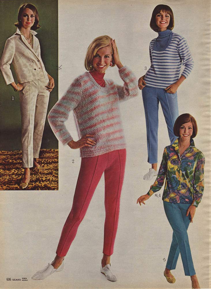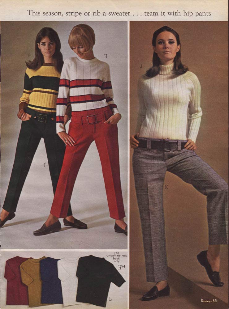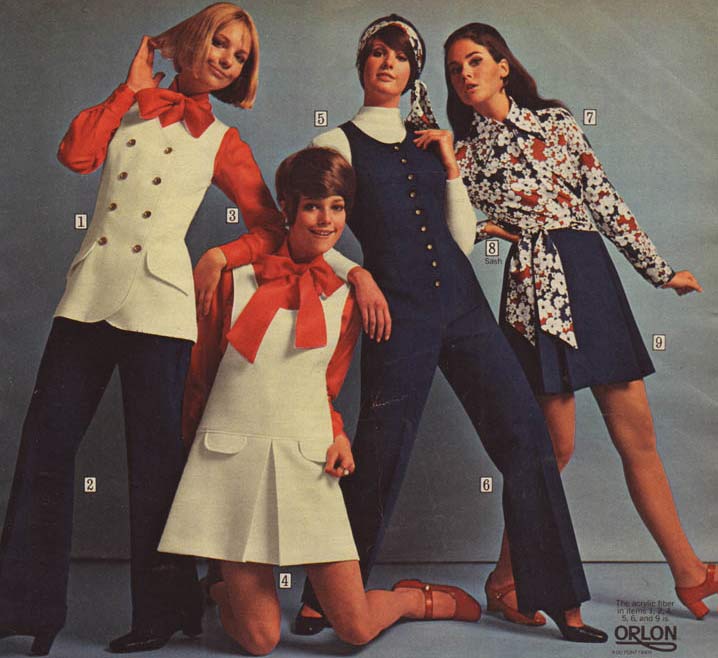 The late sixties were the era of the flared-bottomed pants, foreshadowing the much more obvious bell-bottoms of the seventies. Polyester was a very common material and skirts were short. Women were no longer embarrassed to flaunt their stuff in public.