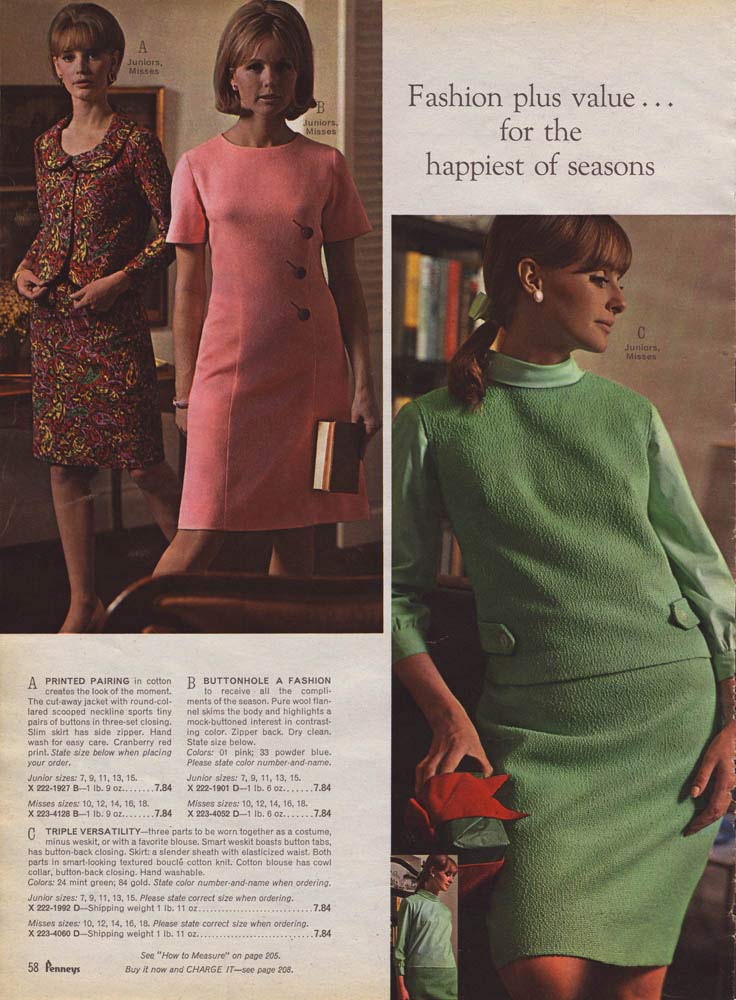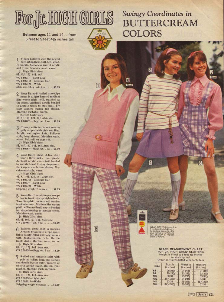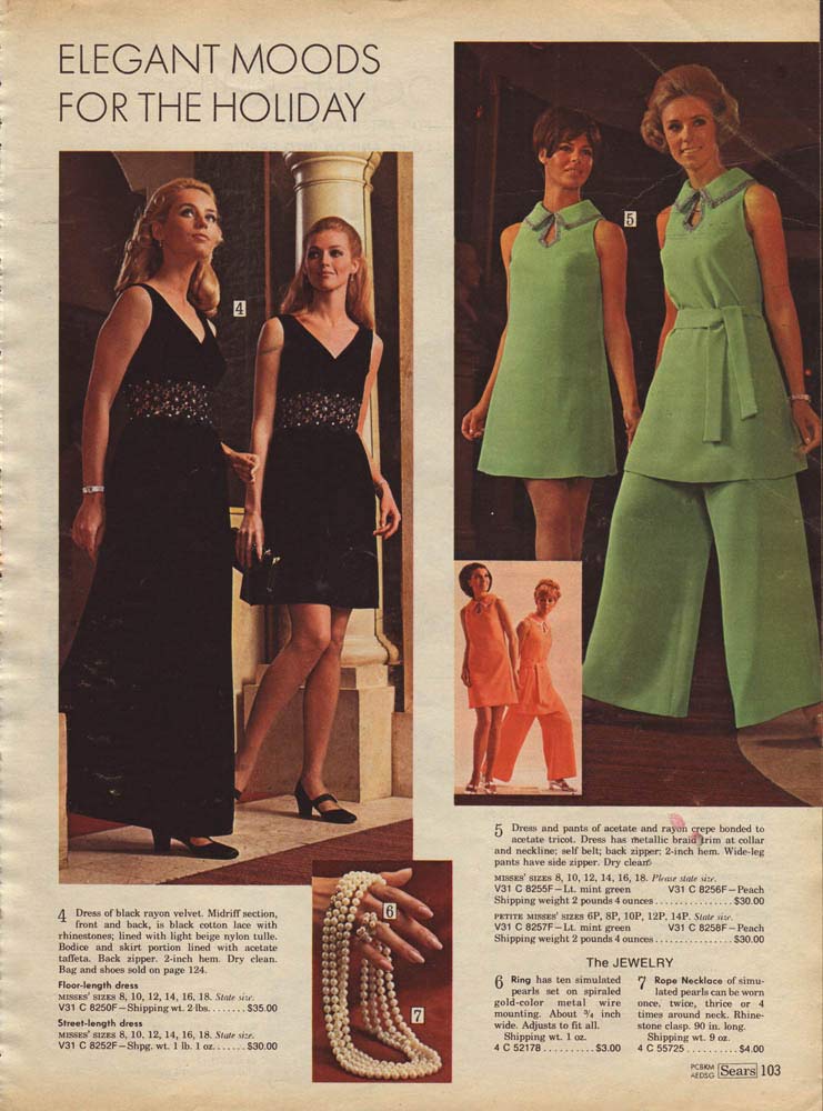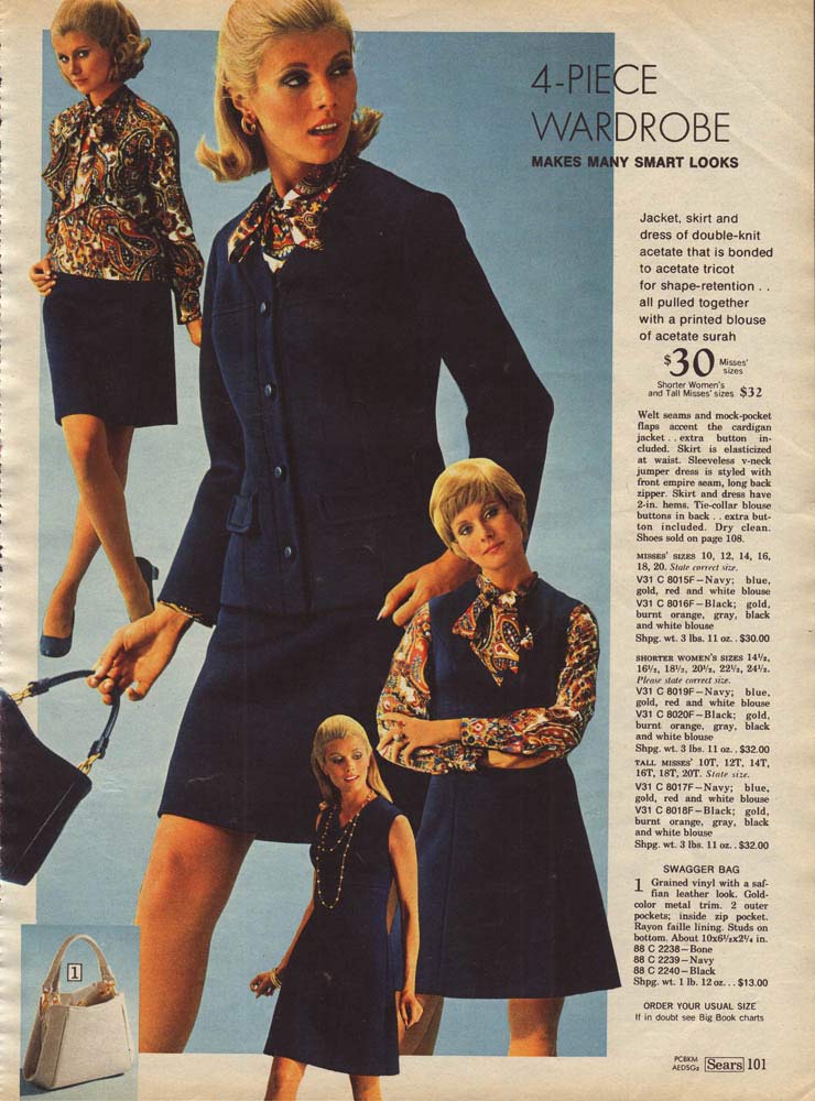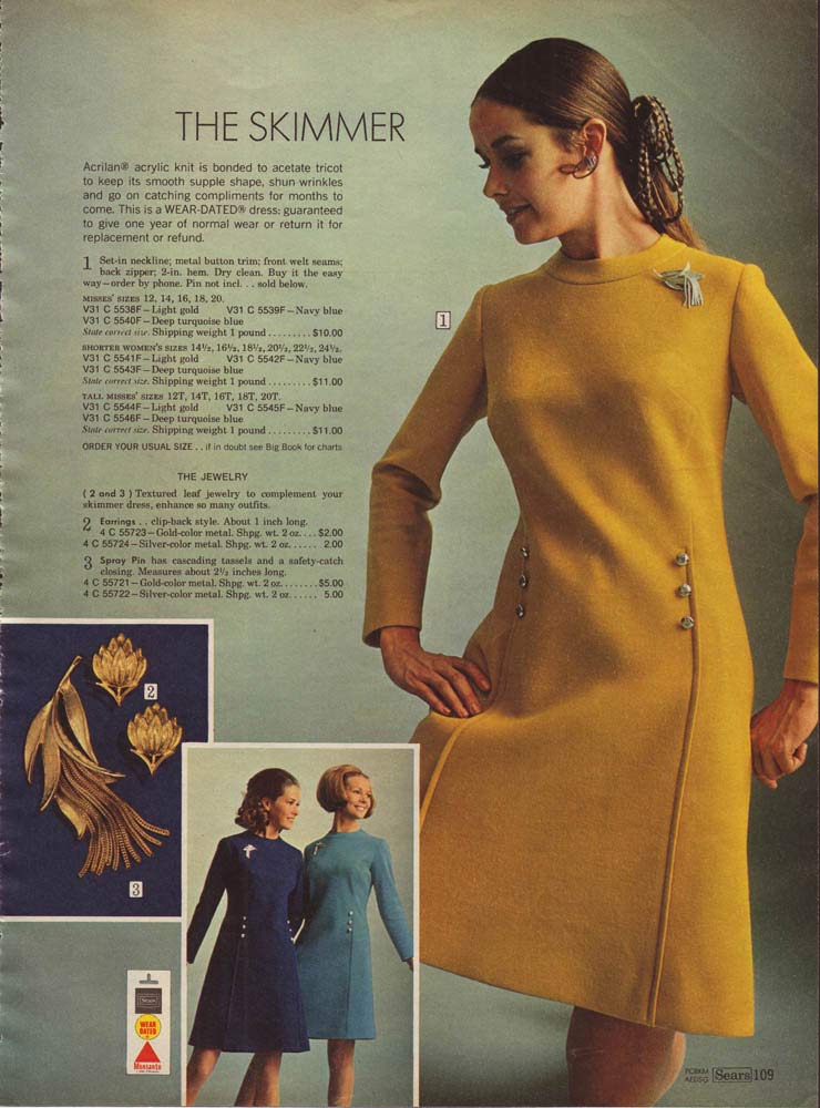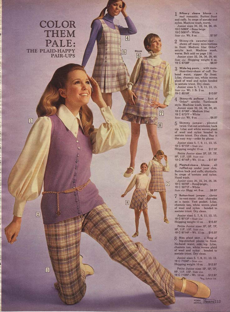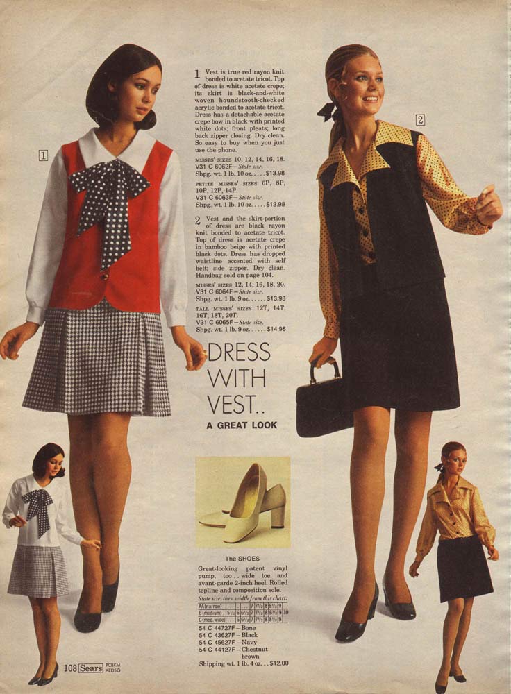 The late sixties were the era of the flared-bottomed pants, foreshadowing the much more obvious bell-bottoms of the seventies. Polyester was a very common material and skirts were short. Women were no longer embarrassed to flaunt their stuff in public.