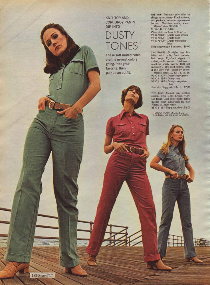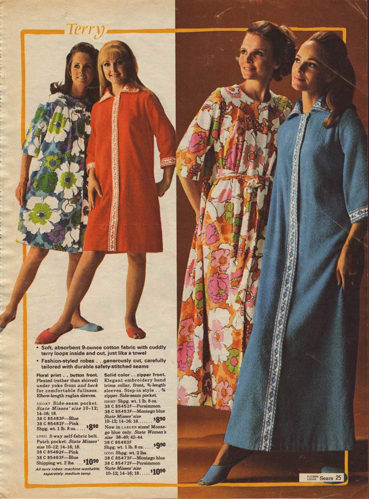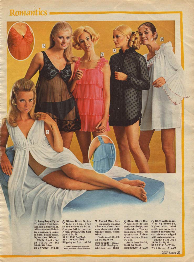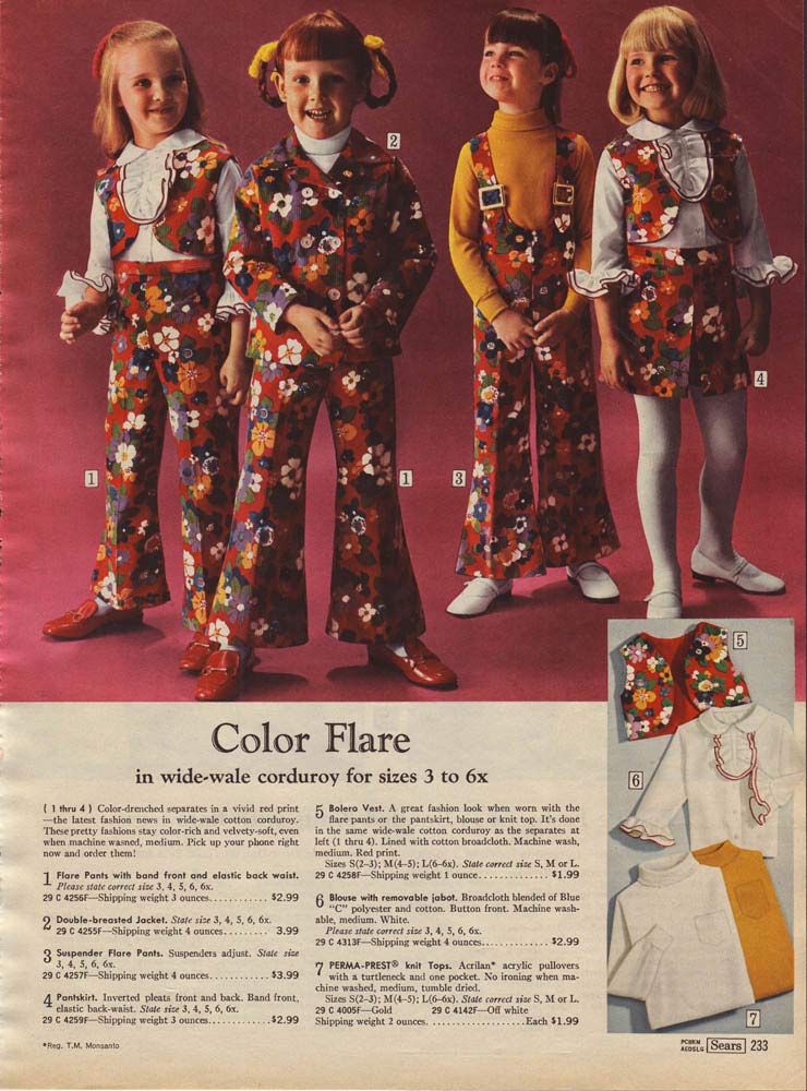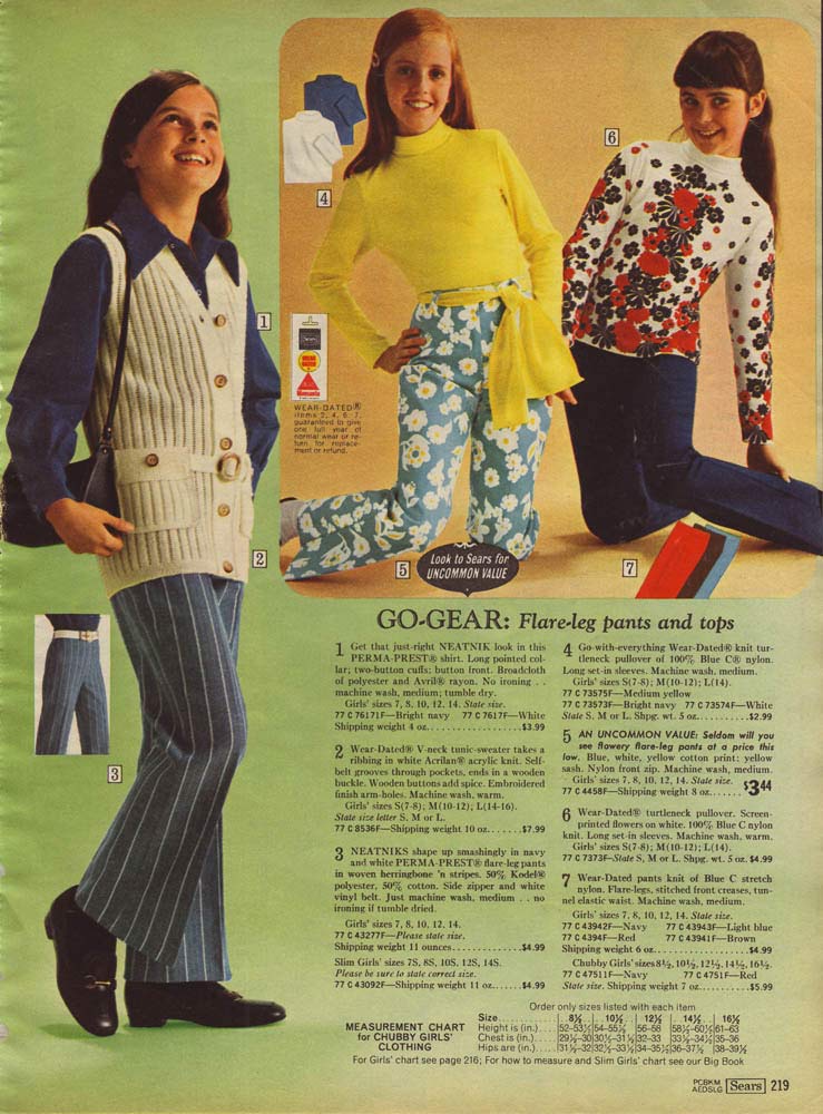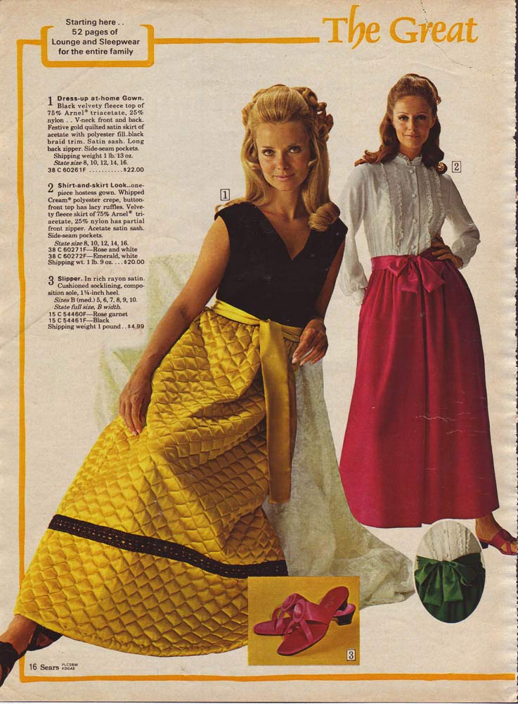 The late sixties were the era of the flared-bottomed pants, foreshadowing the much more obvious bell-bottoms of the seventies. Polyester was a very common material and skirts were short. Women were no longer embarrassed to flaunt their stuff in public.