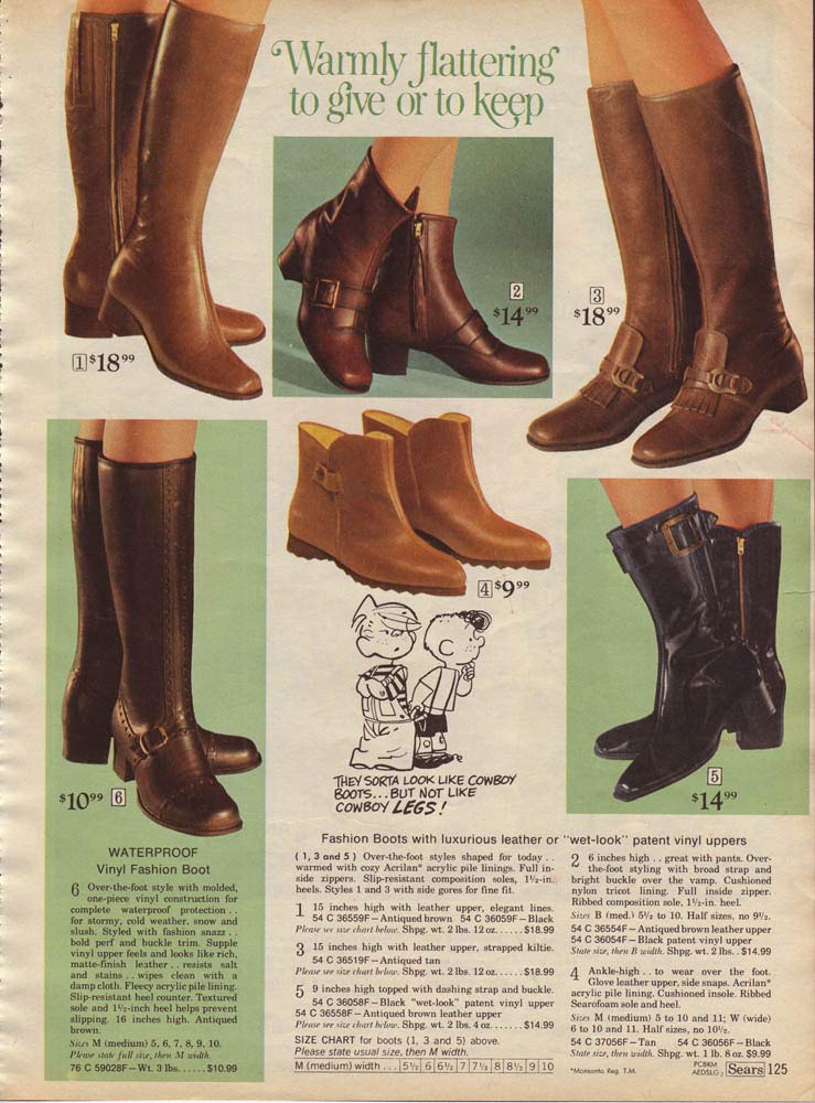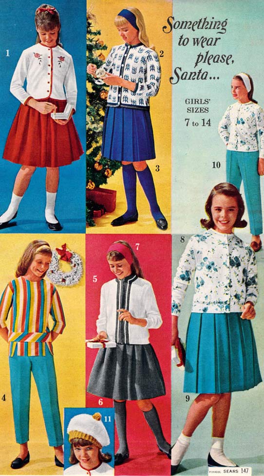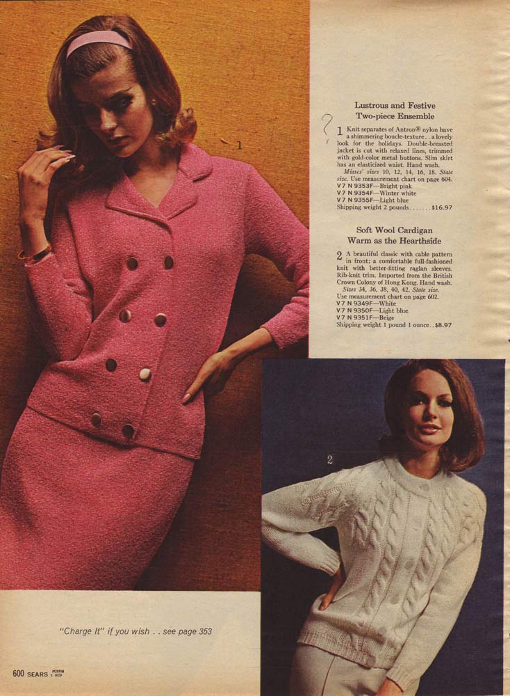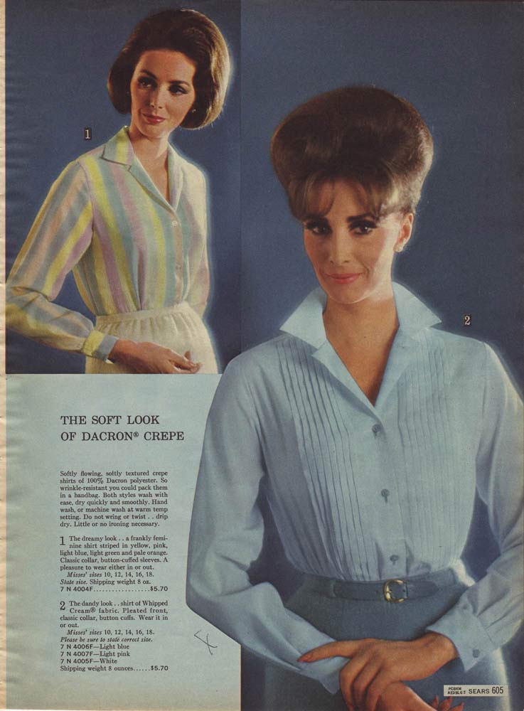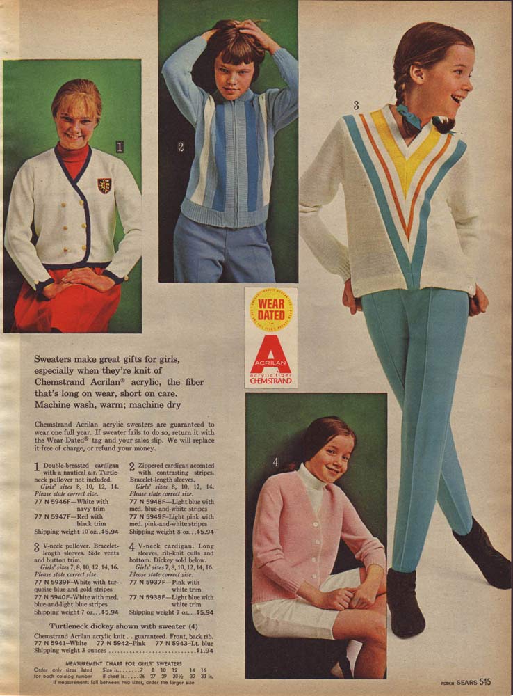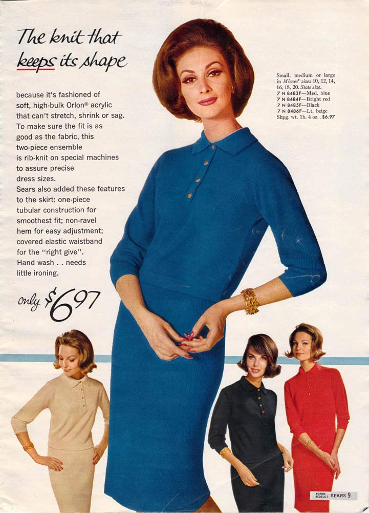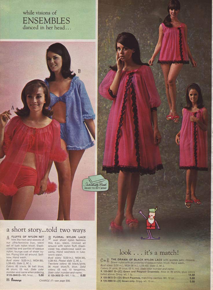 The late sixties were the era of the flared-bottomed pants, foreshadowing the much more obvious bell-bottoms of the seventies. Polyester was a very common material and skirts were short. Women were no longer embarrassed to flaunt their stuff in public.