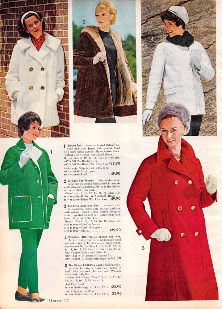 Soon after, the British Invasion featuring the Beatles ushered in a new era of British dominance in fashion, music and culture in general. By 1966, the early-sixties look had become much more sleek and modern. The lines were sharper and more form-fitting. Fur was less popular, but gloves were still a necessity. Most of this fashion sense was taken directly from the London mod scene.