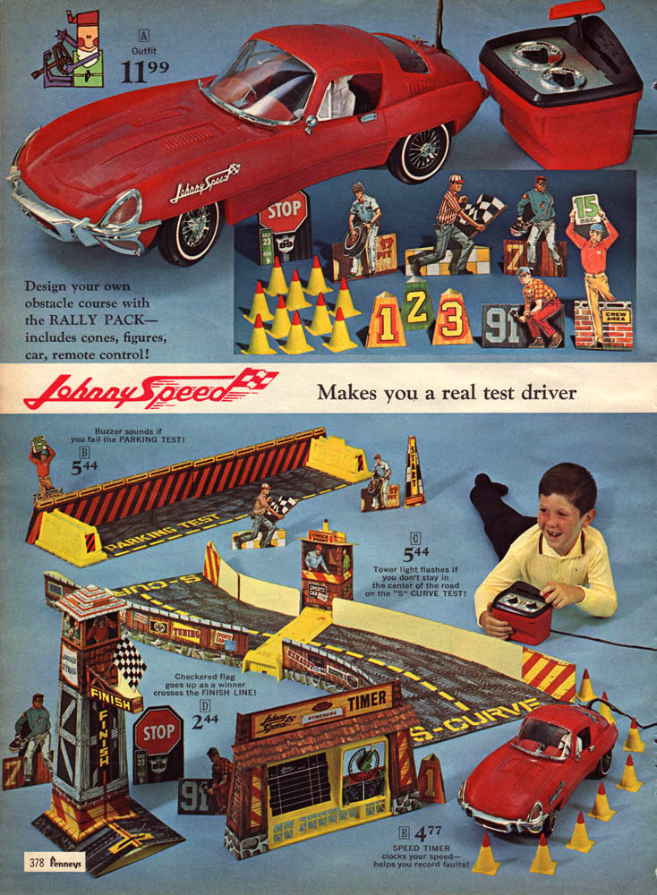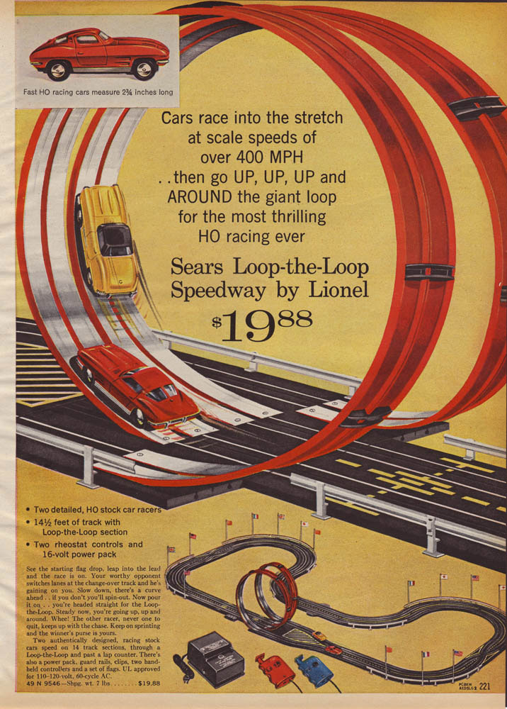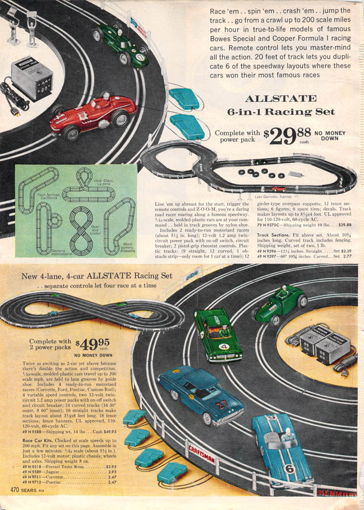 Slot cars were growing in popularity. By mid 1965, about 2,000 “slot car centers” were open. The centers provided tracks on which the plastic cars could be raced and enthusiasts could compete for prizes.