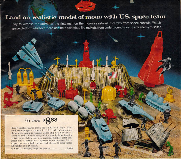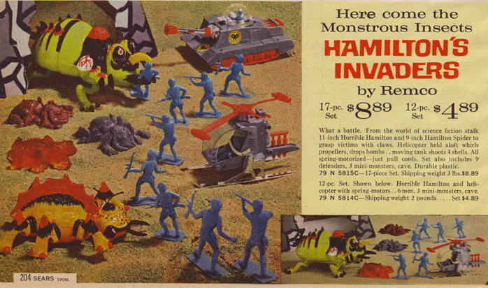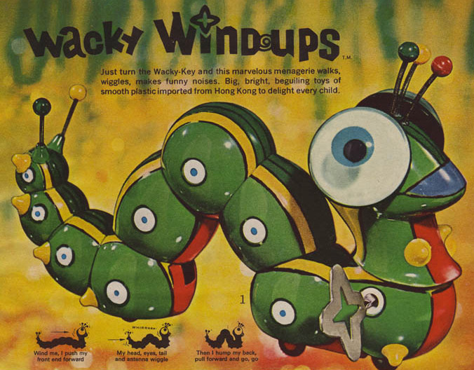 It was the year of the monsters as grotesque, fanstastic and sinister figures showed up on toy counters and became and immediate hit. Made of plastic, they included old standbys such as Frankenstein’s monster and Dracula and also strange new characters called “Weird-Ohs”, “Rat and Bat Finks”, “Drag Hags” and “Surfink” (a monster on a surfboard). They were used in games, jigsaw puzzles and even in liquid bath soap dispensers tagged to “Scare You Clean.”
