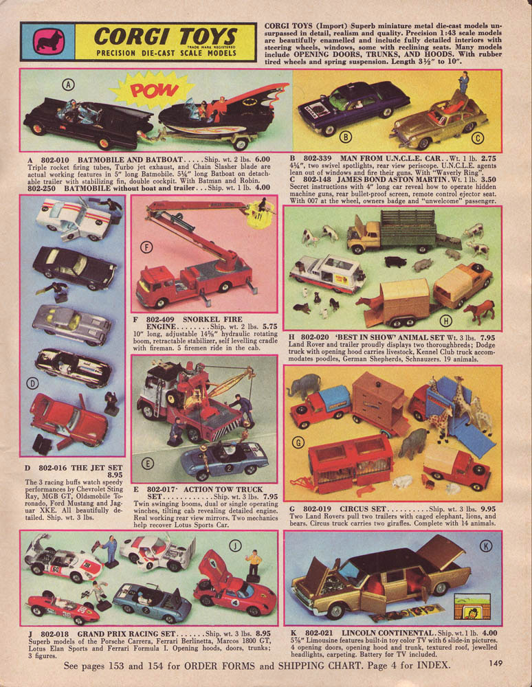 Batman and secret agents invaded the toy field. There were Batman art toys, games, costumes, wheel toys, model kits and a Batman walkie-talkie. There were also Batman figures, airplanes, radios, hats, a dart launcher, and Gotham City, all on display at the 1966 Toy Fair in NYC.