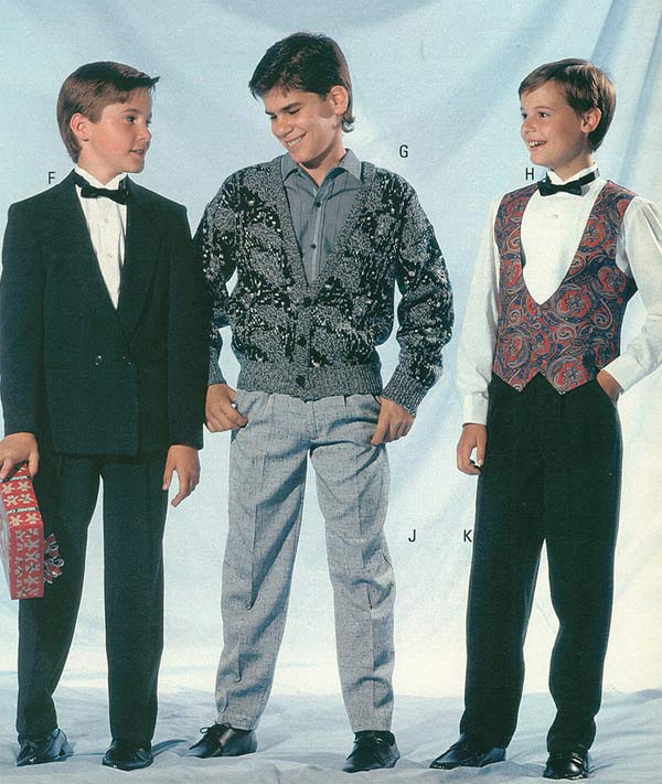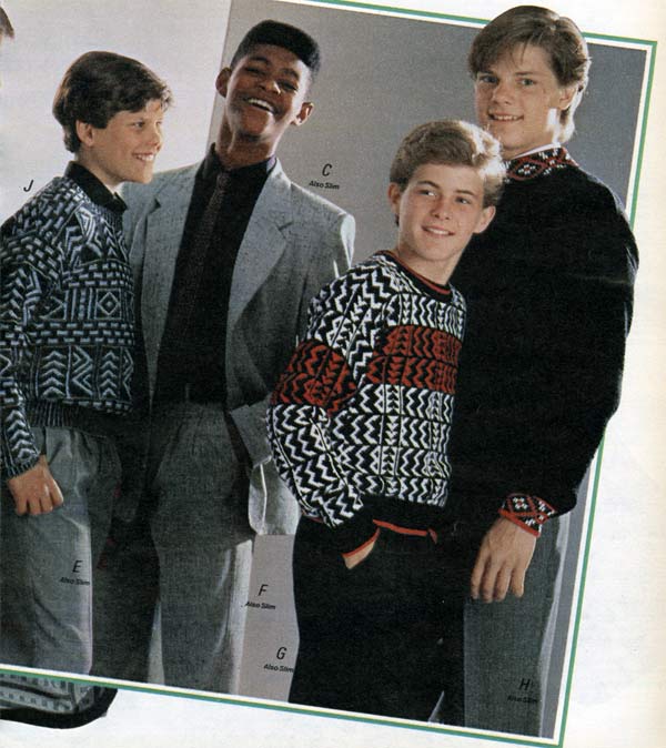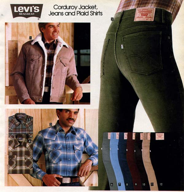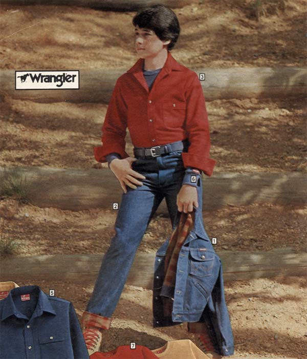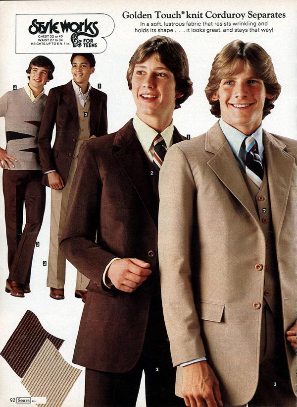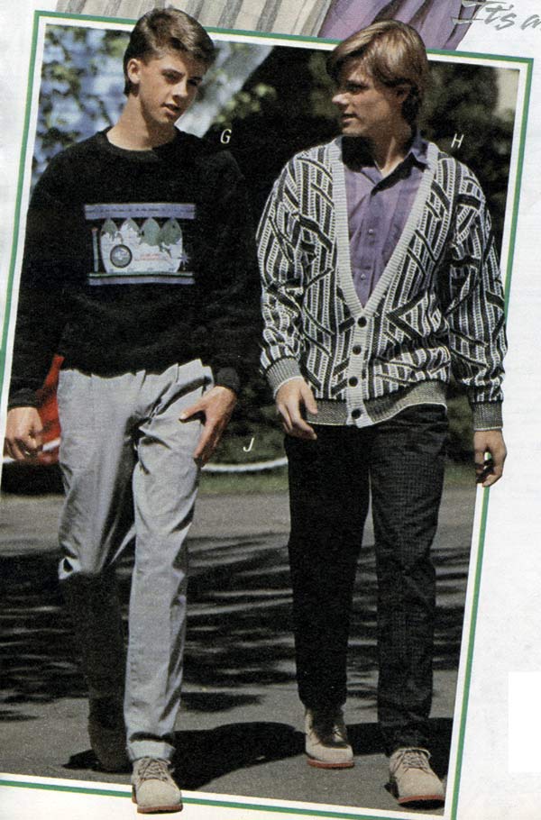 Teenage boys wore lots and lots of denim. Denim jackets were complimented by matching denim jeans. Also corduroy pants were a hot item.