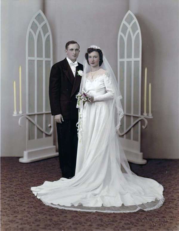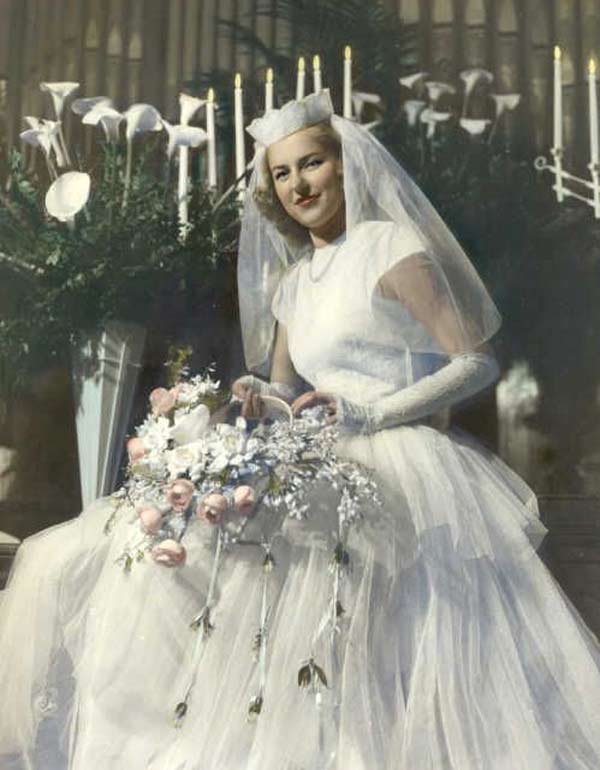 Traditional wedding dresses in the 1940s were white. Starting in the mid 1940s, many young celebrities were getting hitched, being photographed wearing dress suits or their Sunday best. It had become pretty normal to skirt the whole wedding dress altogether.