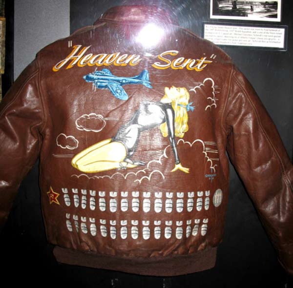 They often decorated their jackets with squadron patches and artwork painted on the back. We have an extensive A-2 flying jacket picture gallery below. Many of the paintings featured barely clothed women and hilarious words like: Twwwaaaaannnngg and Miss Wiss Ding. Jackets also usually included the name of the plane they flew.
