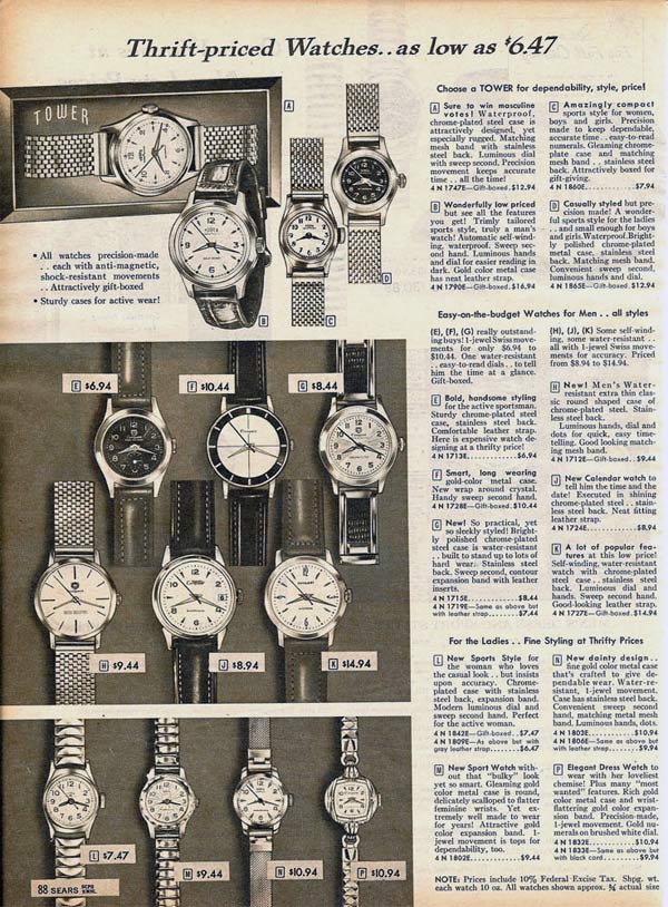 Different watch brands that were popular in the 1950s include Tower, Timex, Orvin, Bulova and Elgin. Watch faces came in many different shapes and colors. Square and round faces were the most popular.