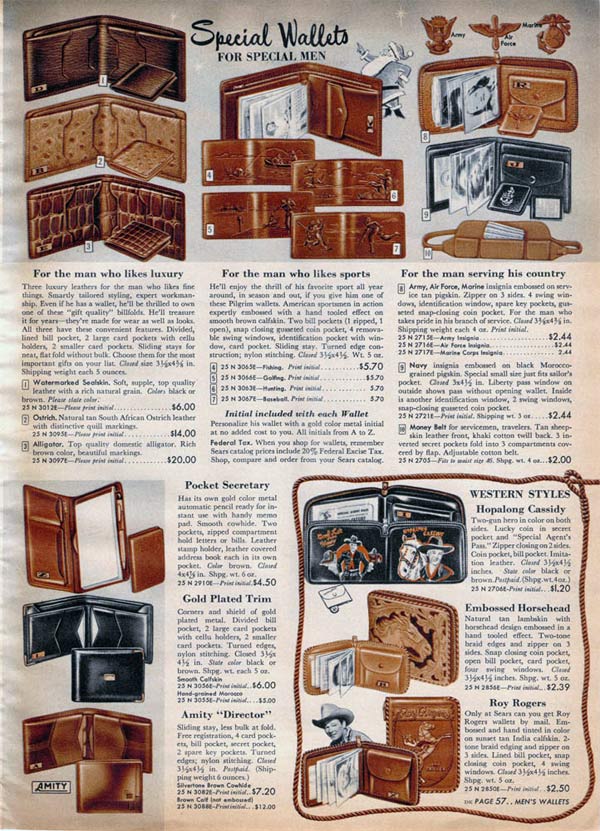 Some wallets zipped around the edges to keep it closed and other had secret compartments. For that extra personal touch, men could get a wallet with his initials, his name or his favorite activity (like fishing) embossed on the front.