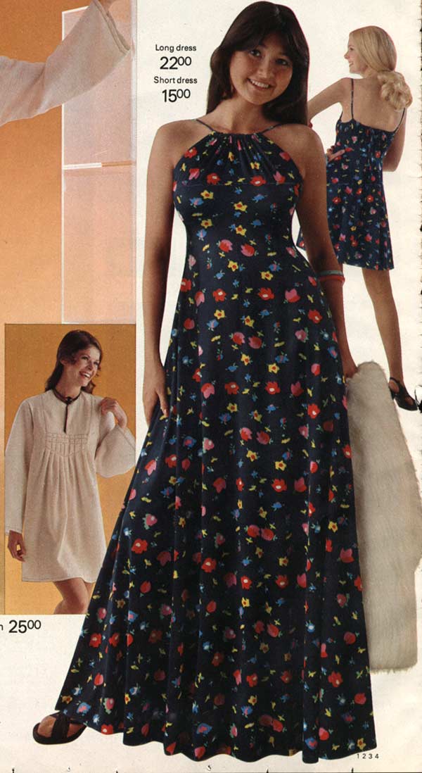 Much of the experimental, so-called “hippie” style actually originated in the early 1970s. Flower power was in full swing at the beginning of the decade and it showed in the flowing, floral patterns that decorated many dresses from that era.