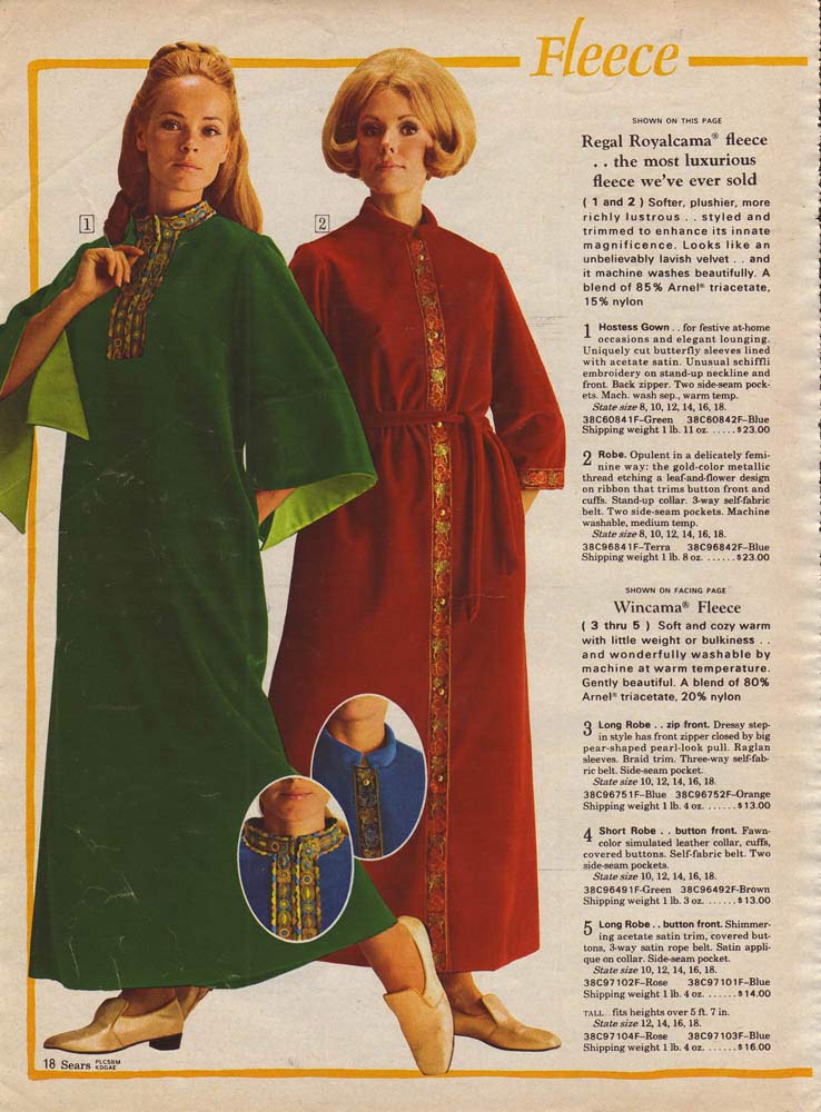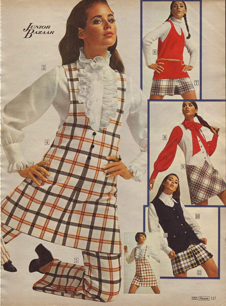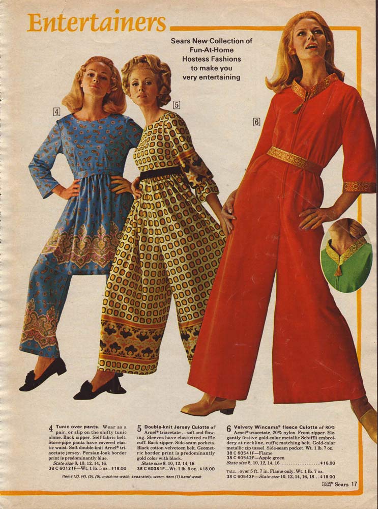 The late sixties were the era of the flared-bottomed pants, foreshadowing the much more obvious bell-bottoms of the seventies. Polyester was a very common material and skirts were short. Women were no longer embarrassed to flaunt their stuff in public.