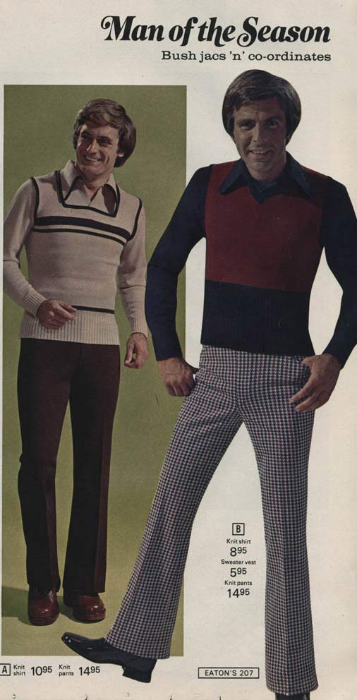 Men’s fashion started to shed the flamboyant styles of recent years, but they retained a sense of fun and freedom. Clothes were snugly fit, tailored and double knit. Plaid was a popular choice for a day at the office or on the farm and pants remained flared.