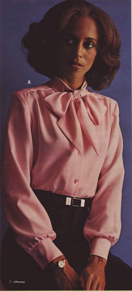 The Executive Woman owned at least one tailored suit. The jacket could be either short and shapely or long and lean. The straight skirt was knee-length and could possibly have a front or side slit that put a subtle emphasis on the legs. To offset the more traditionally masculine look of “business suit style”, women were experimenting with hats, high heels, ruffles that peaked out from the jacket and large jewelry to keep a confident, yet feminine, look in tact.
