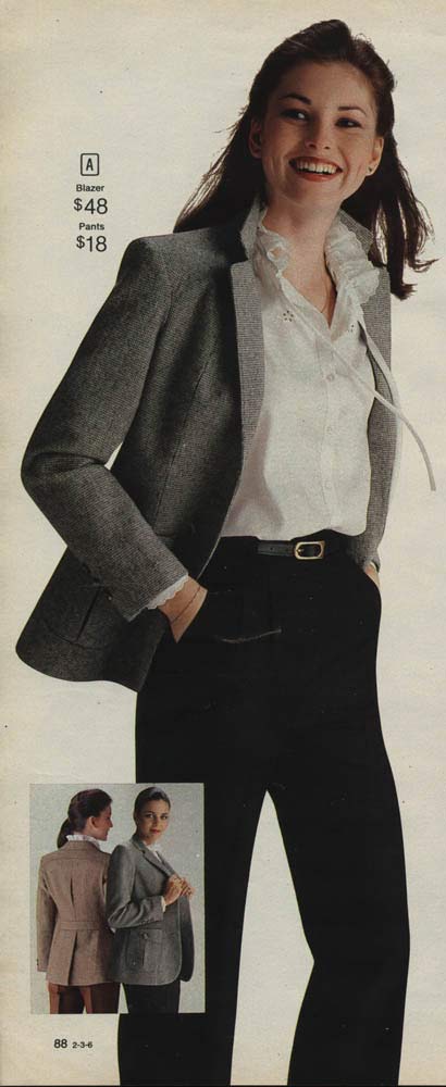 With an increased emphasis on formality, blazers and pants skirts became much more easily mixed and matched. The trend of heavily padded shoulders first hit the scene in 1978, which borrowed and somewhat exaggerated the 1940s look, had surged more visibly into the mainstream in 1979.